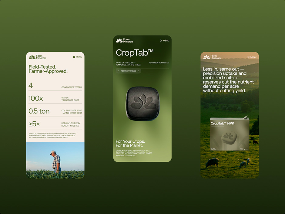 One of the key challenges of the project for the Adelt team was visualizing a technology that operates at a microscopic level inside plant cells. Communicating this process directly would have required complex scientific diagrams, which could easily make the interface feel too technical.Instead, the visual storytelling focuses on the CropTab tablet itself. The product becomes the central visual element of the website designed by Adelt, appearing in multiple contexts across the page. Close-up product shots, environmental scenes, and subtle motion help connect the technology to real agricultural practice.