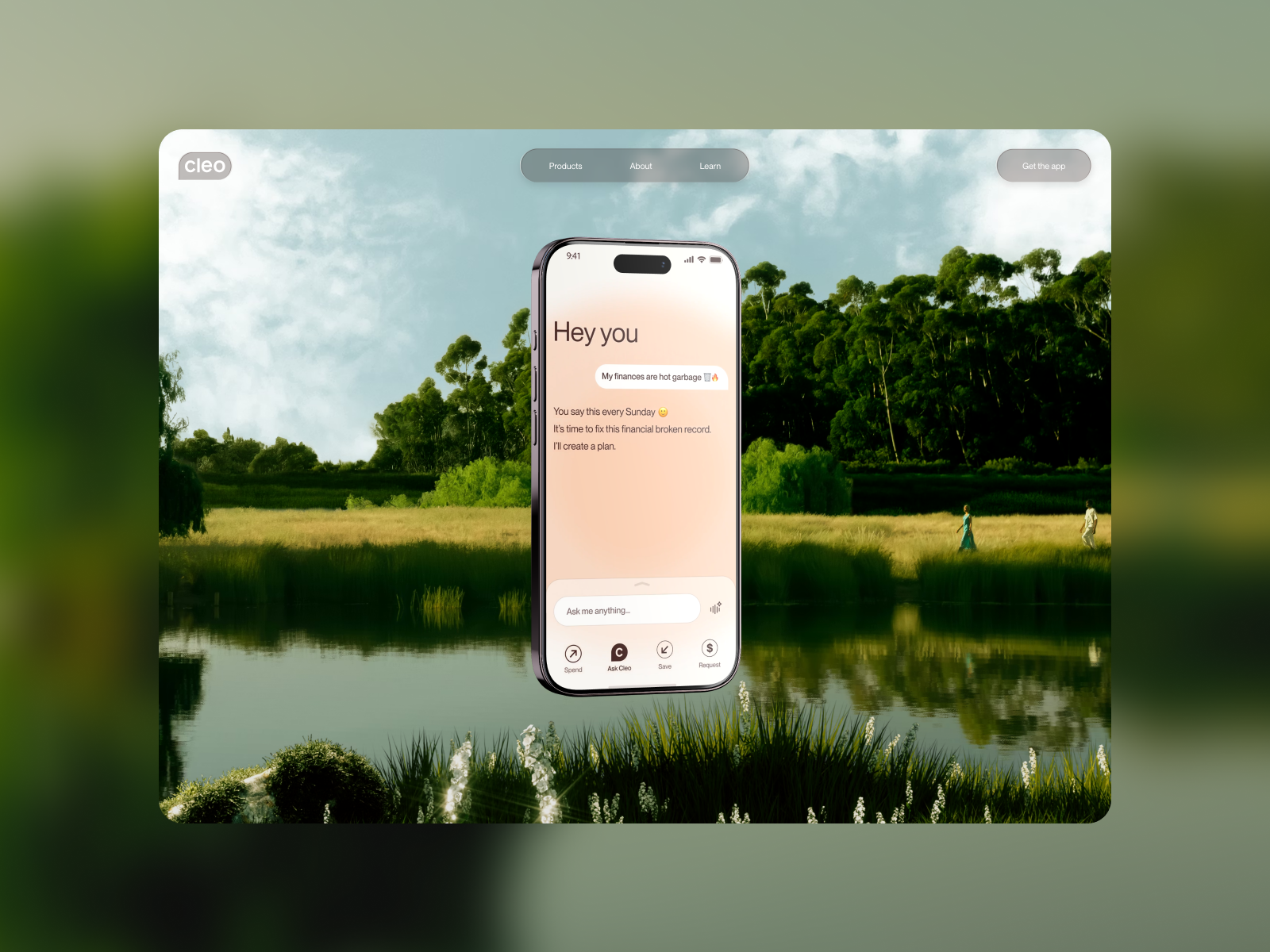 Cleo isn’t a bank - and proud of it: an ultra-modern, silky-smooth, and very “un-bank-y” website for this AI financial genius that’s changing the world’s relationship with money.