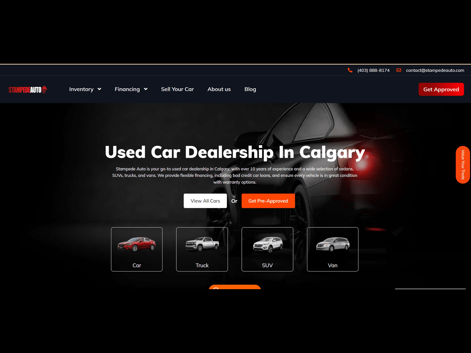 Stampede Auto is a reliable used car dealership in Calgary with 10+ years of experience. Explore our wide range of sedans, SUVs, trucks, & vans, along with flexible financing plans.
