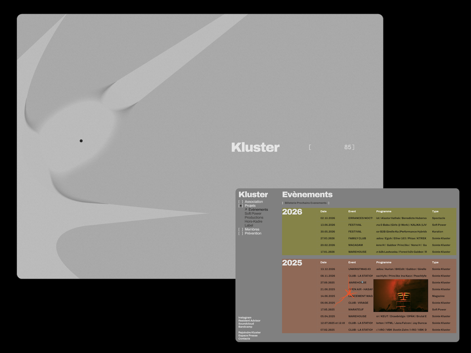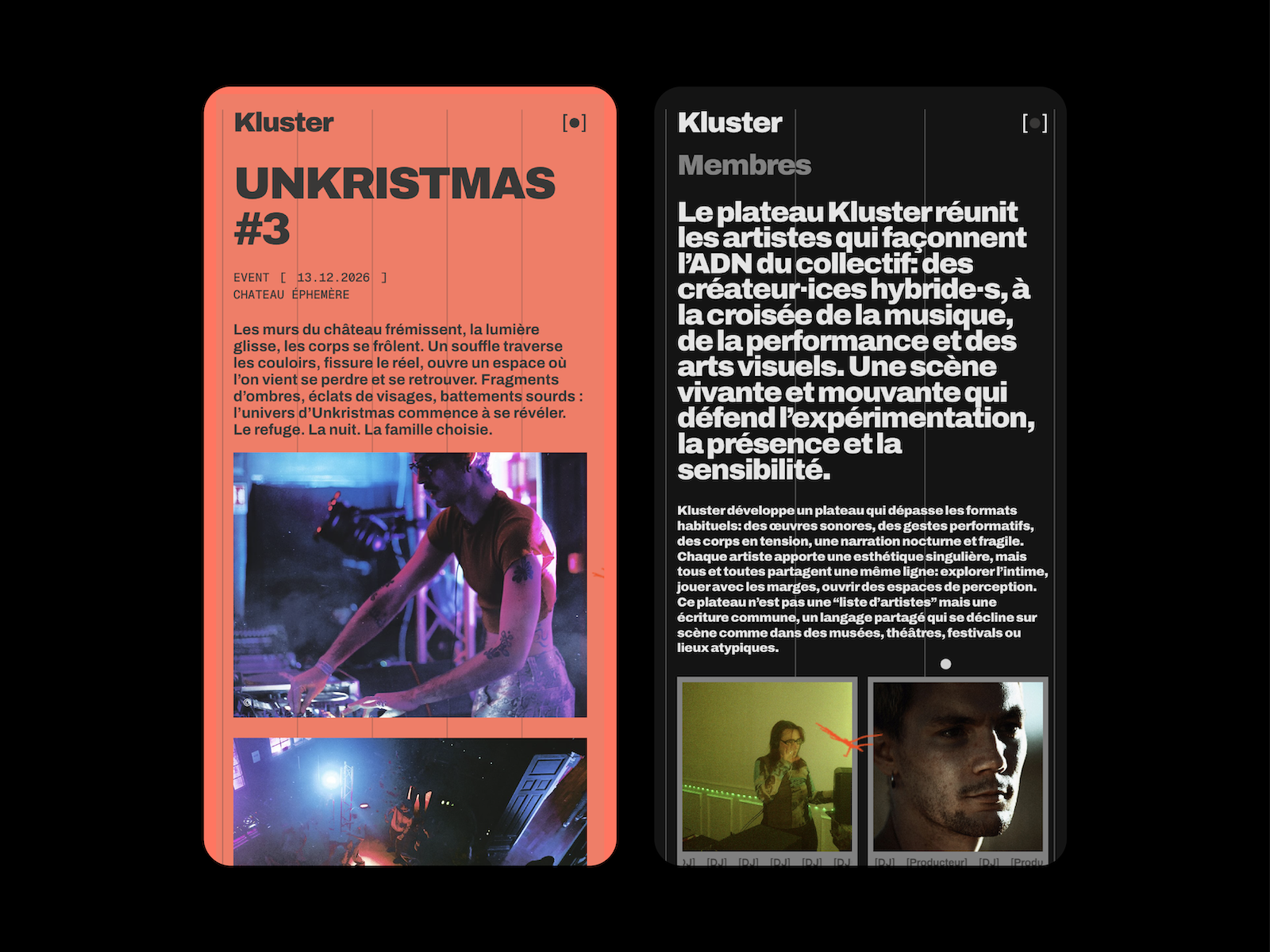 A digital platform for Kluster, a Paris-based collective exploring electronic music through inclusive, conscious and collective experiences.