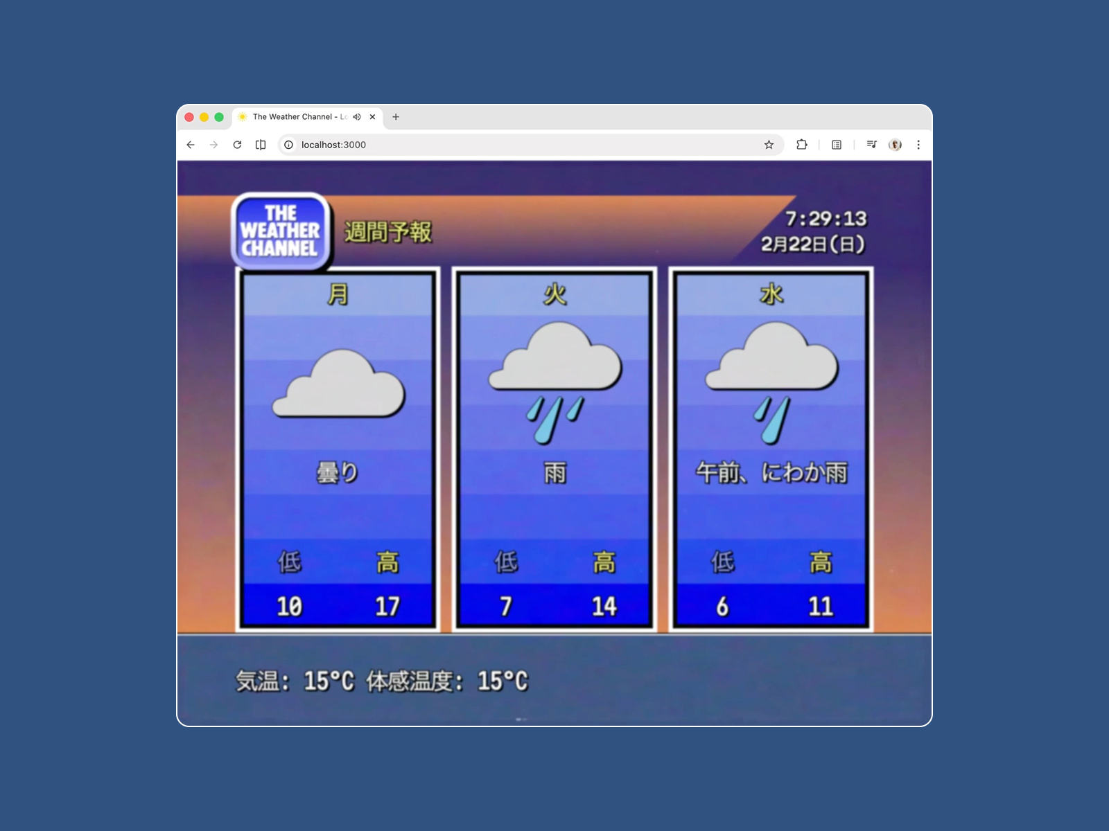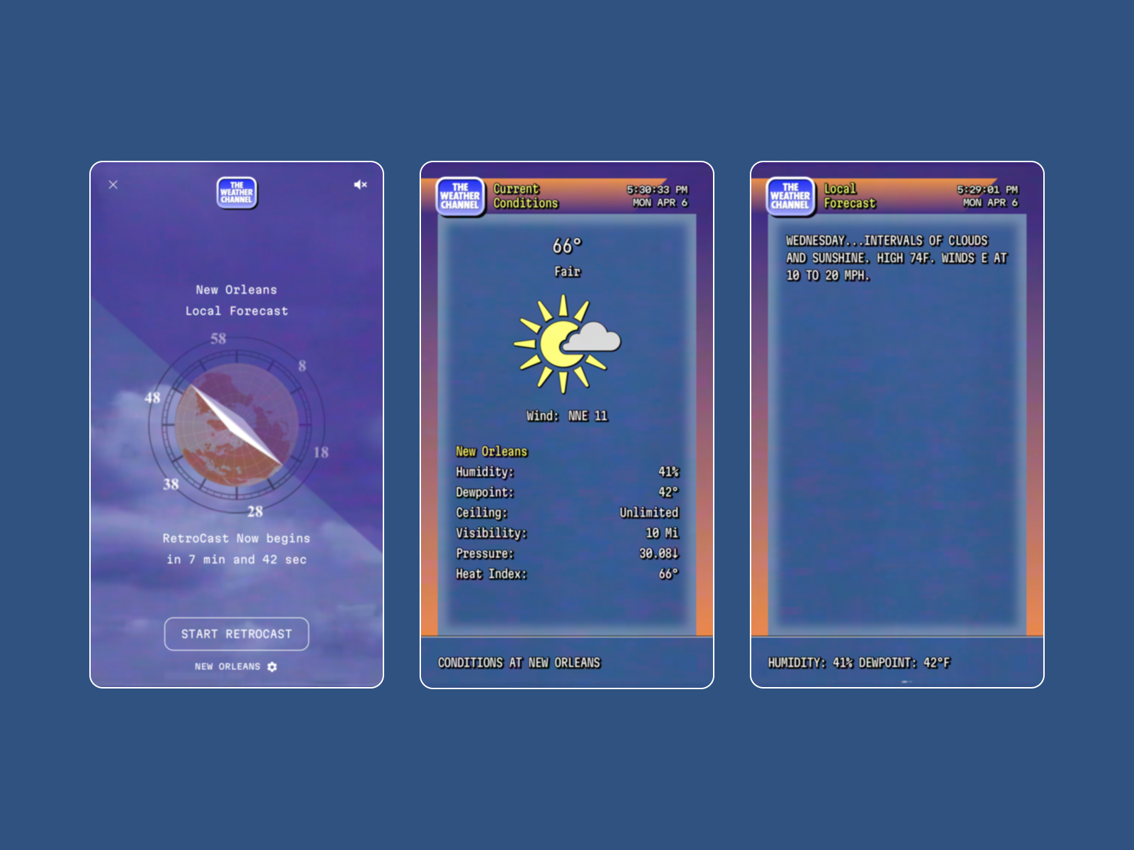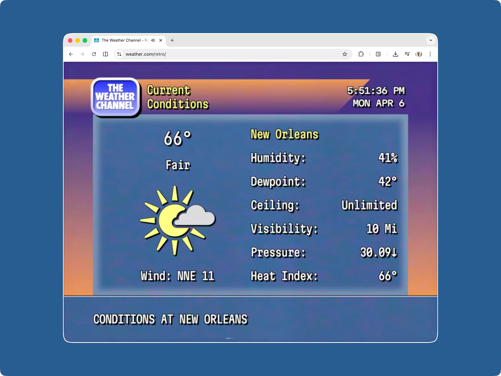 A web recreation of the nostalgic 90s Weather Channel local forecast, broadcast live on the 8s of every hour. Now available for any location worldwide.
