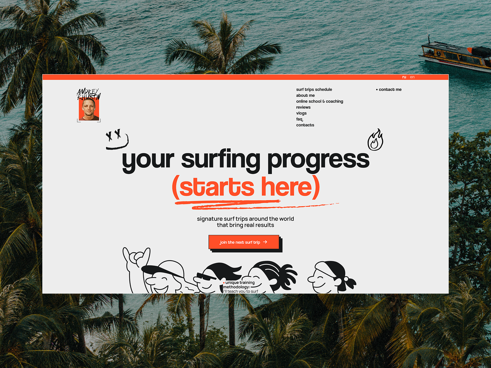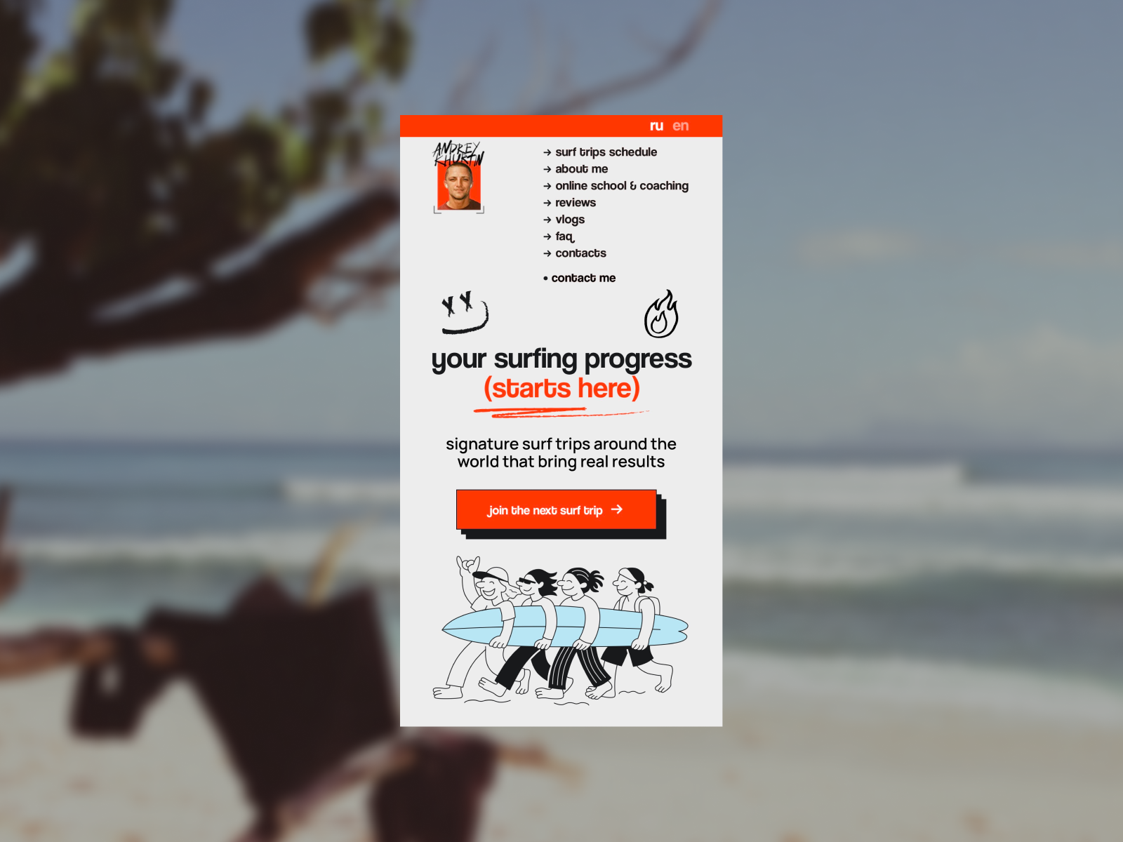 Client project for a surfing academy led by Andrey Khurtin, designed with art direction, custom illustrations, and a clear functional layout.