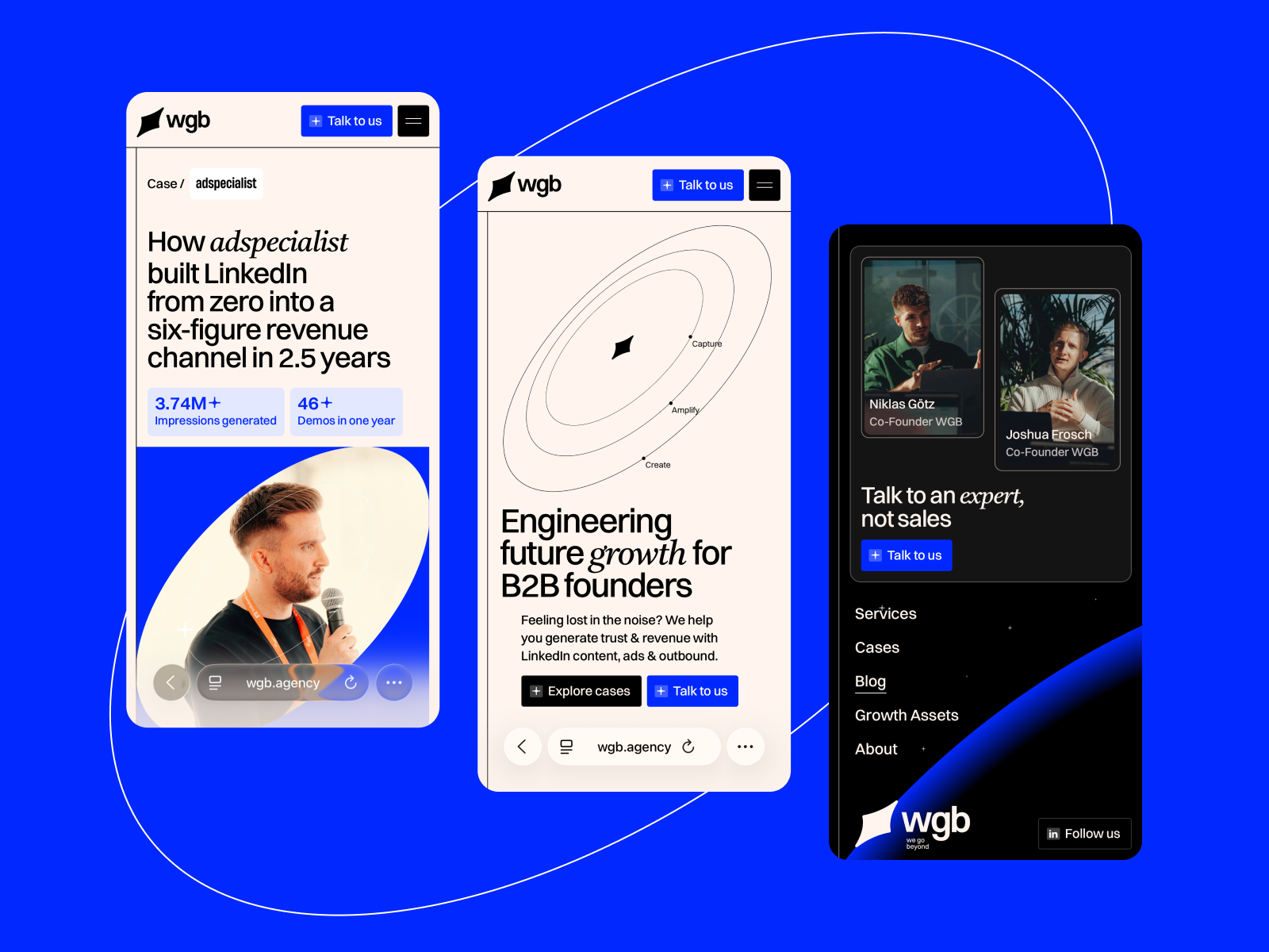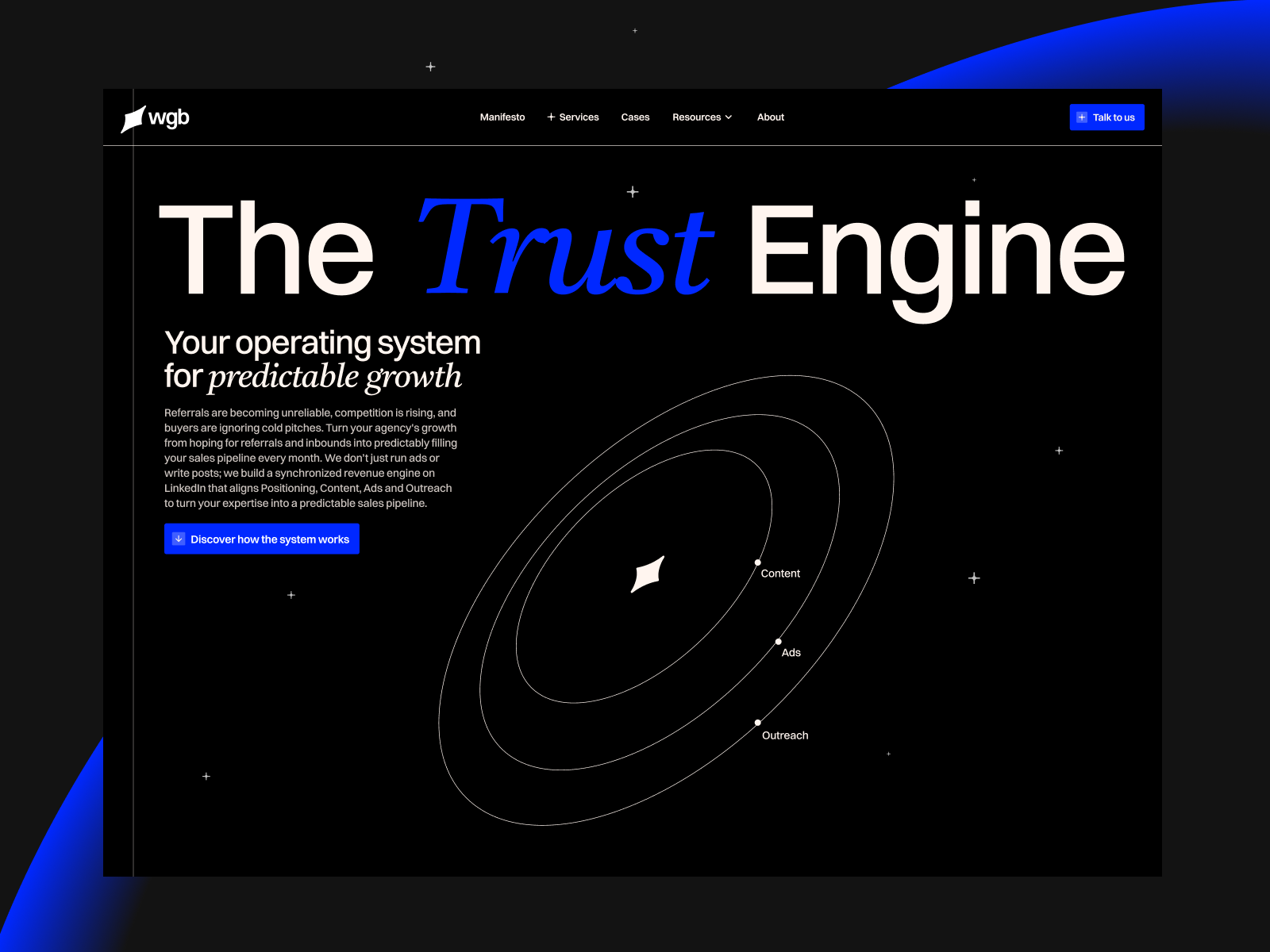 WGB is a Frankfurt-based B2B growth agency. Everything orbits the Trust Engine: a synchronized system of content, ads, and signal-based outreach built for predictable growth.