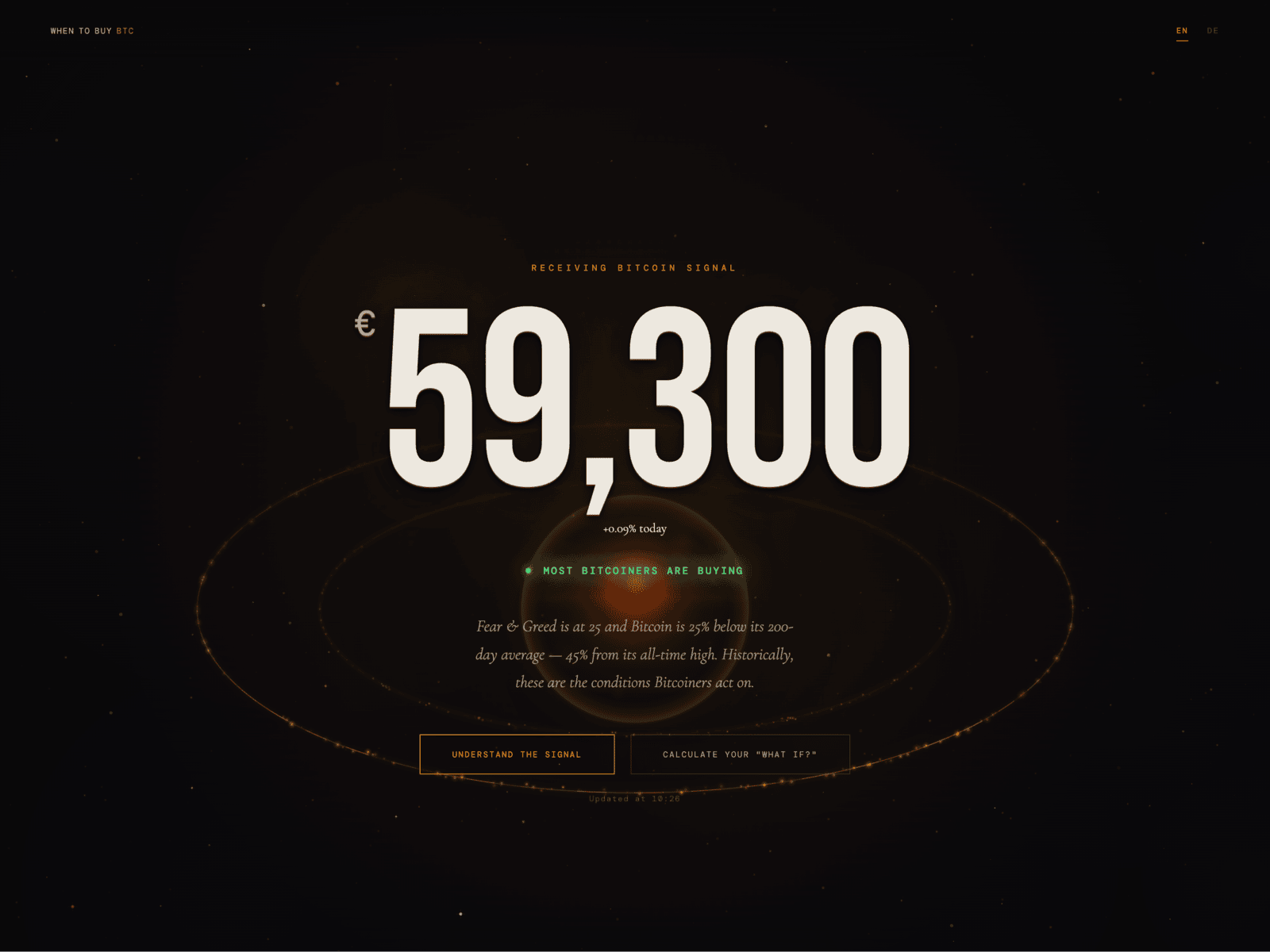 A live Bitcoin market signal tool built like a deep-space instrument. Real-time Fear & Greed, 200-day average & price — rendered as a cinematic planetary system.