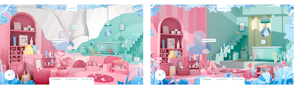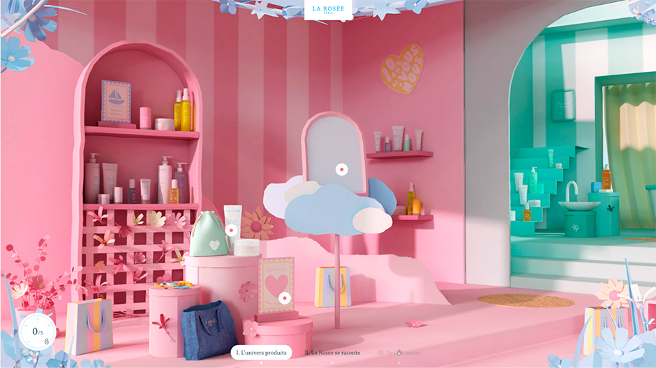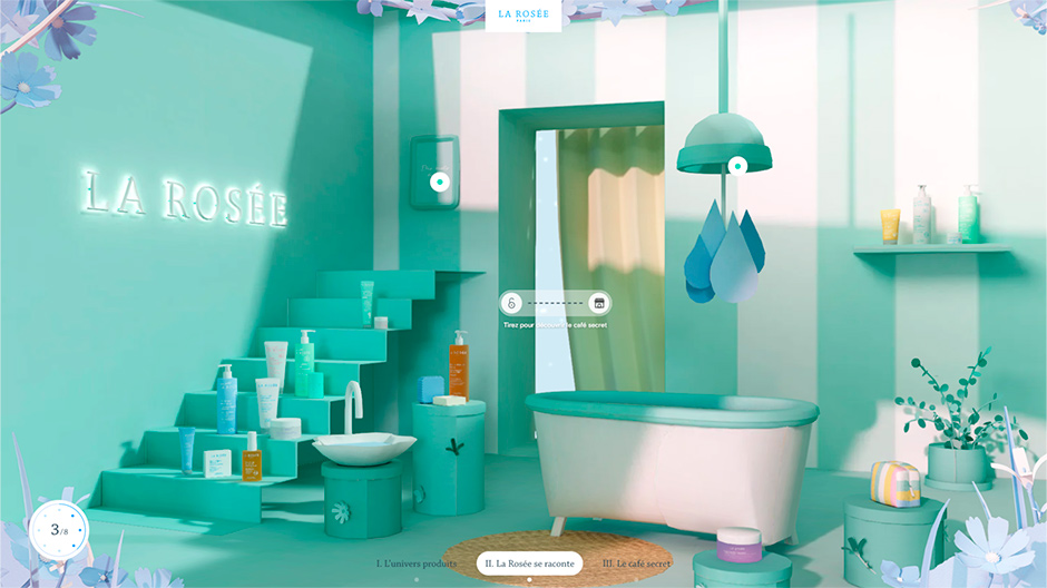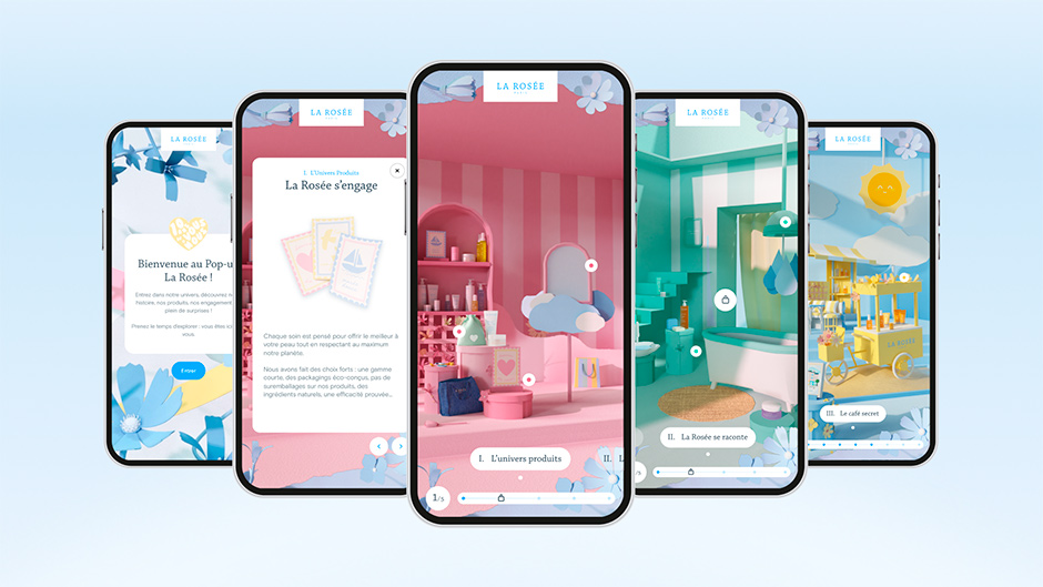 Depth was essential: a floral frame in the foreground layered 2D and 3D elements, pulling users deeper into La Rosée’s world.