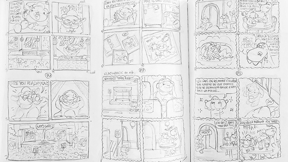 We worked closely on the story together. Justine began sketching early drafts on paper to explore the composition and flow of each panel. These sketches helped us agree on what would be animated, how elements would move, and how transitions between panels would feel.