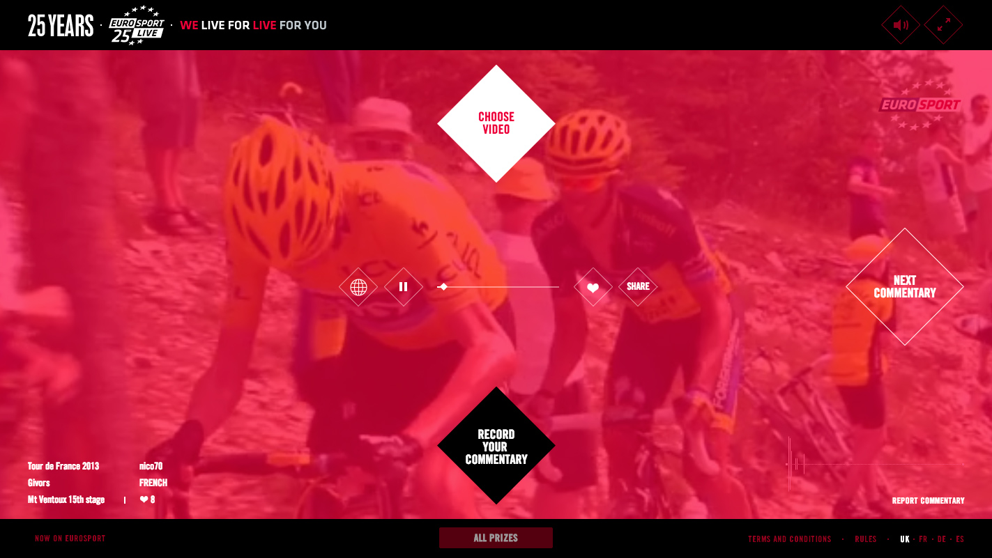 A platform to celebrate the 25 years of Eurosport. An illustration of the promise held to the fans: we live for live for you. Come and comment the best sport images live!
