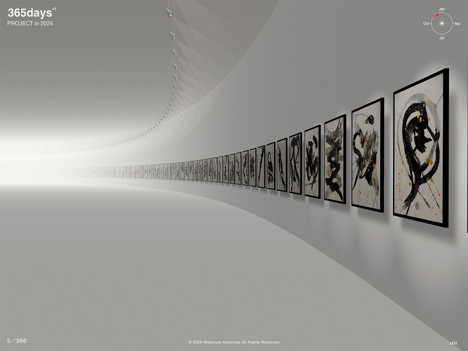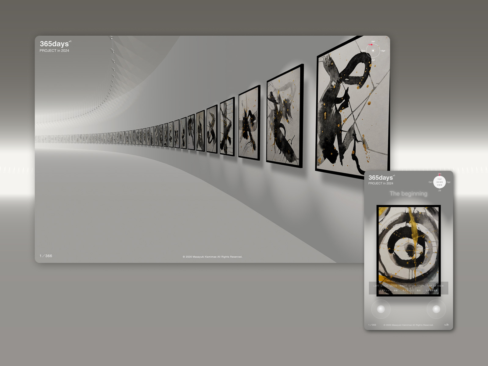 A web experience presenting 366 abstract ink-and-gold paintings — created daily on washi paper throughout 2024 — as an immersive virtual gallery.