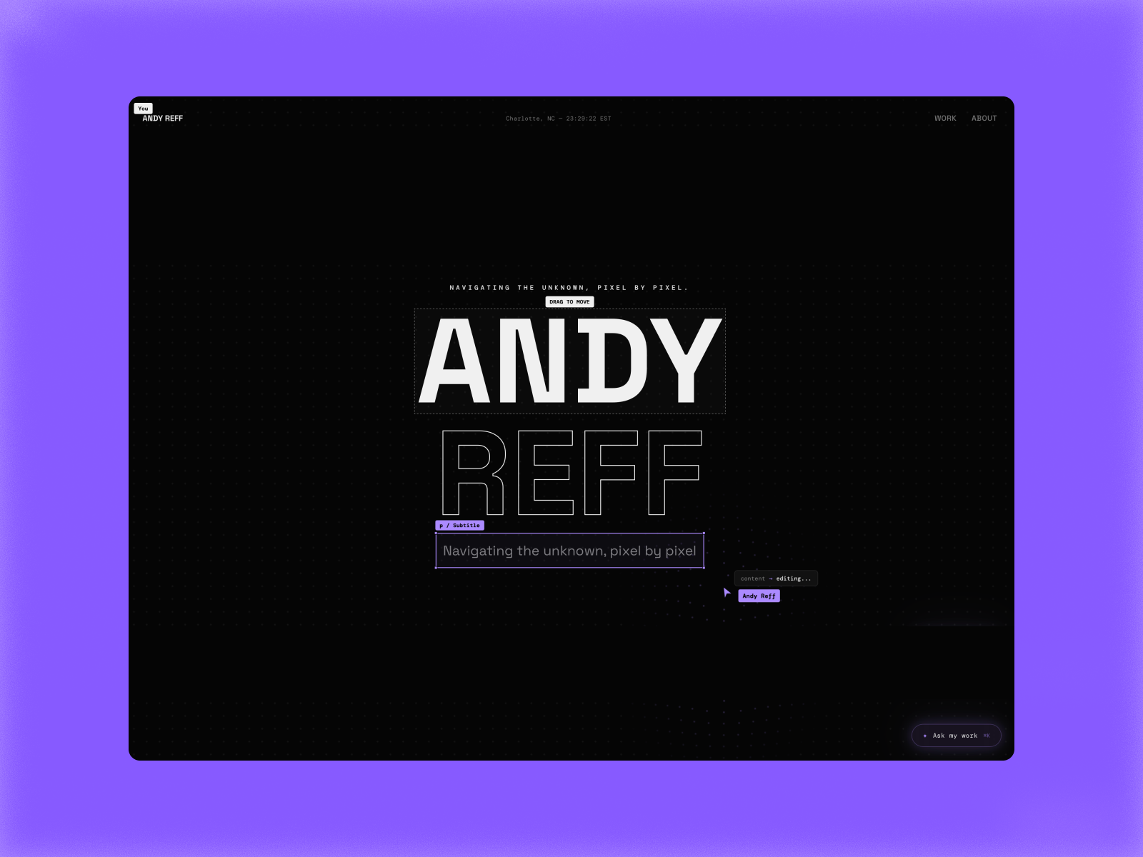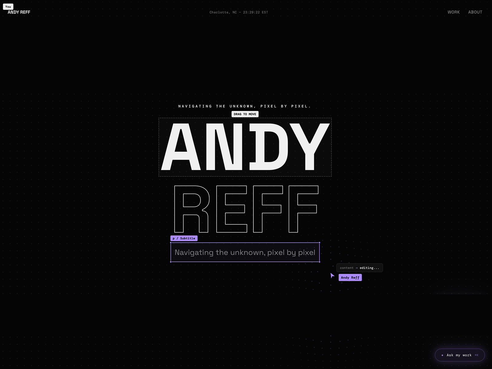 A dark, editorial portfolio showcasing 20+ years of product design — built in React with GSAP animations, an AI chat interface, and a design tool sensibility.