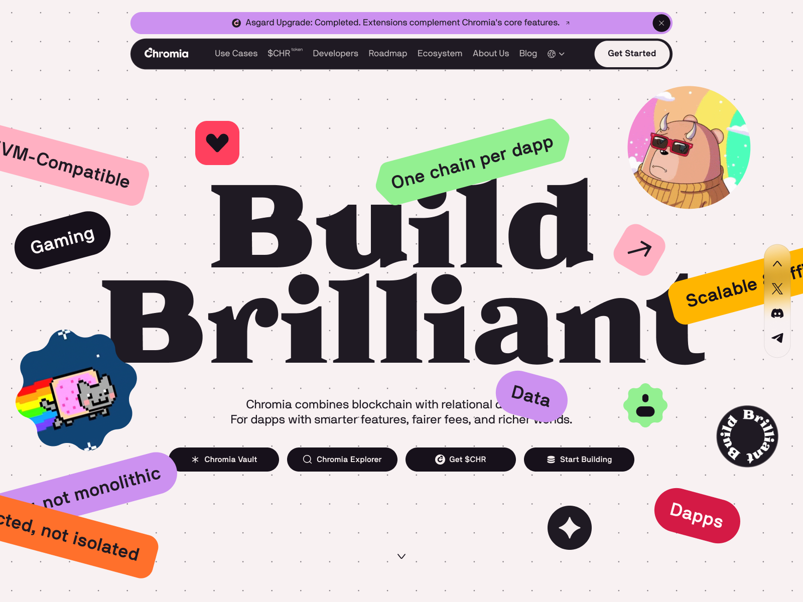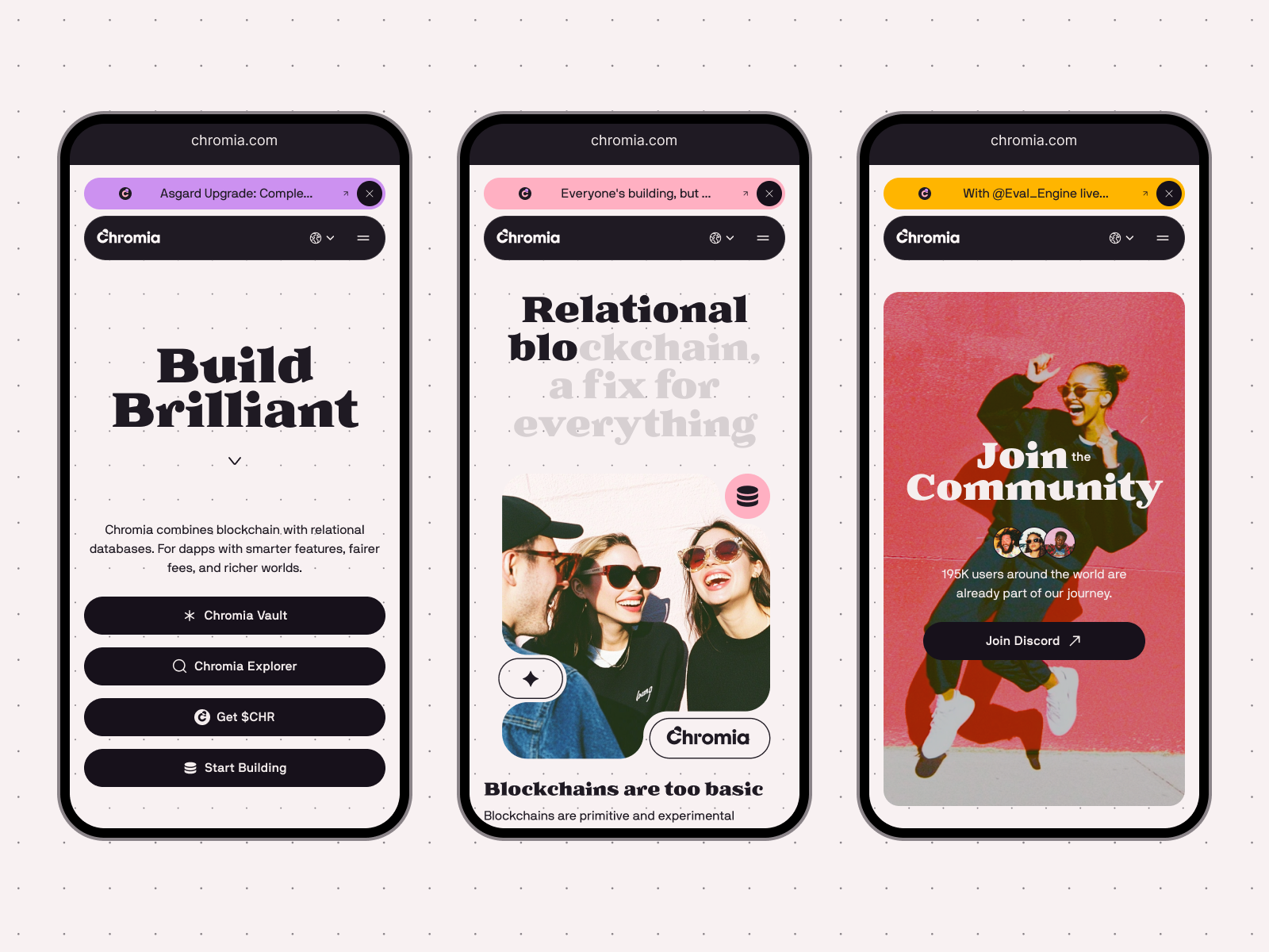 Chromia is a blockchain infrastructure platform. Built to feel human, not “Web3”, its website steps away from clichés through strong structure, visual confidence and restrained motion.