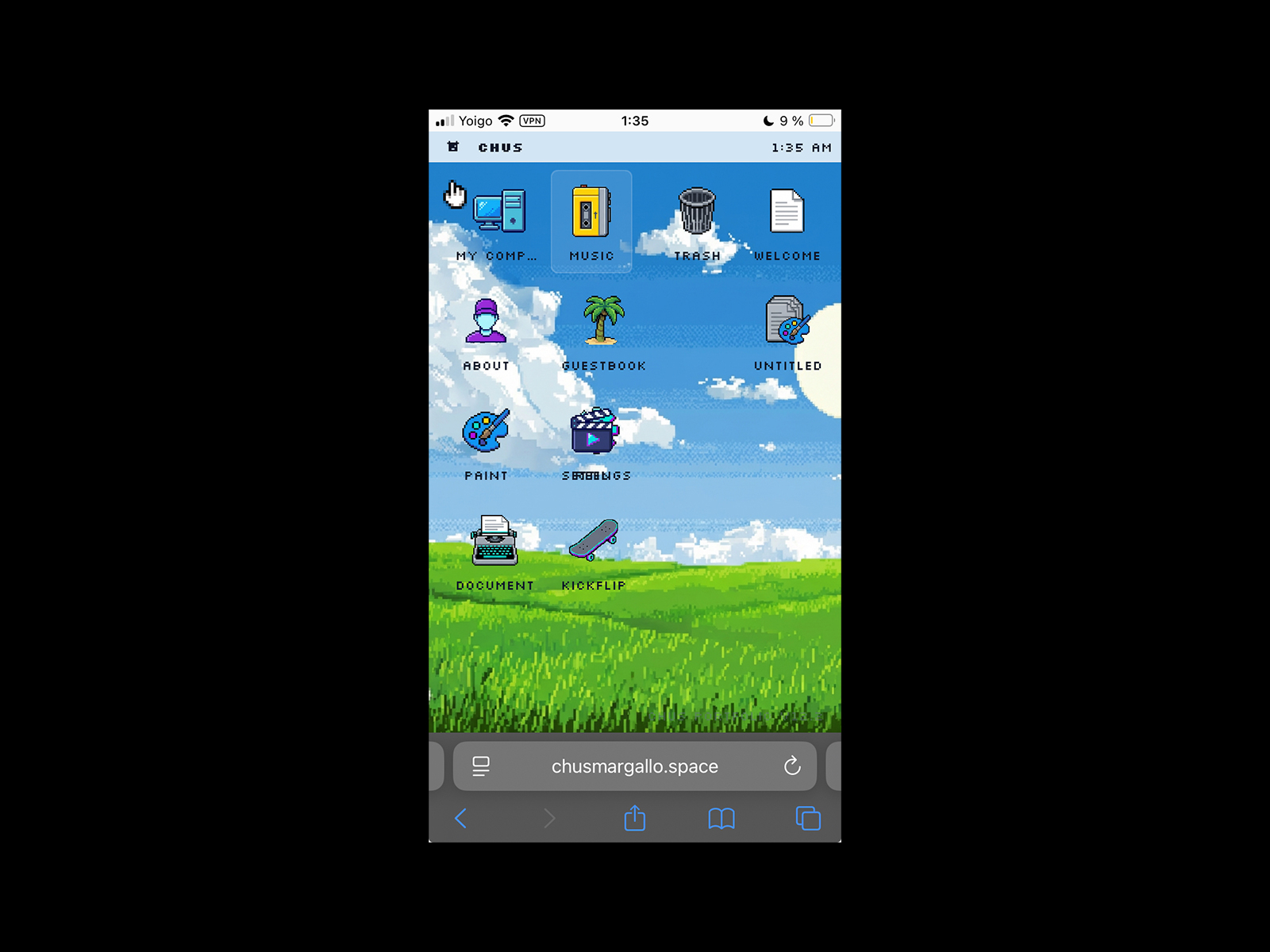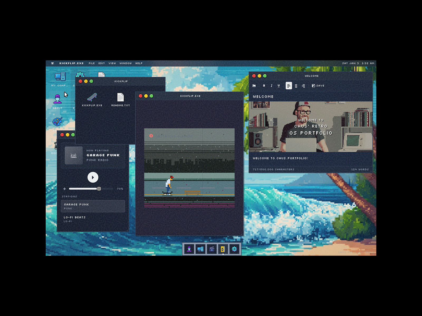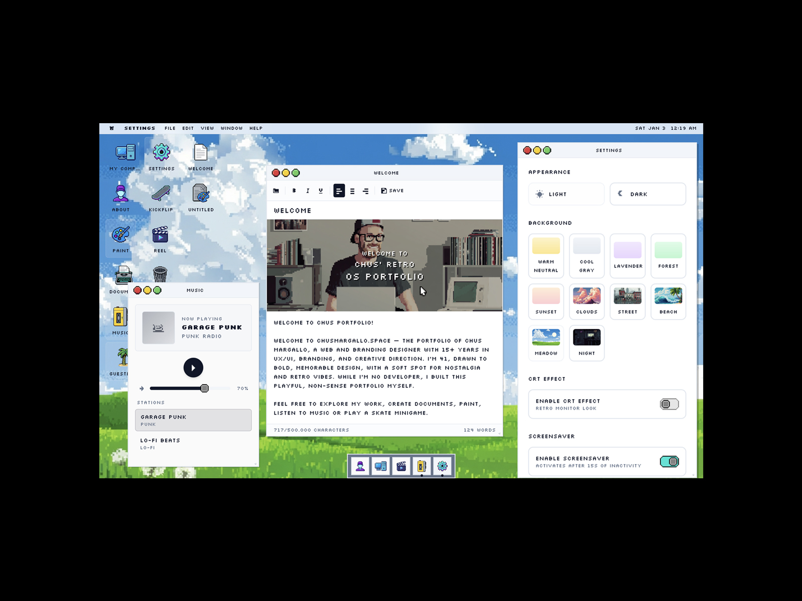 It's a portfolio that functions like a retro Operative System with music player, skate game, writing tool, paint app, guestbook, CRT/Noise effects and screen saver