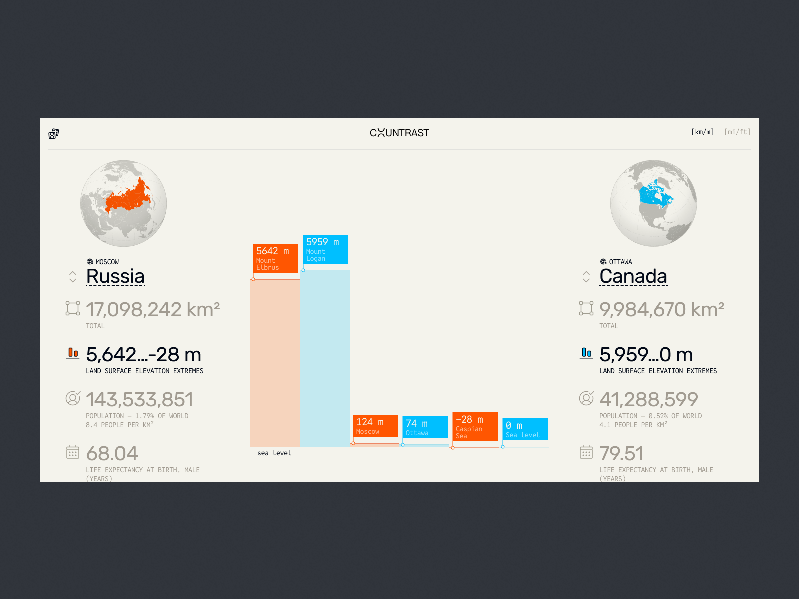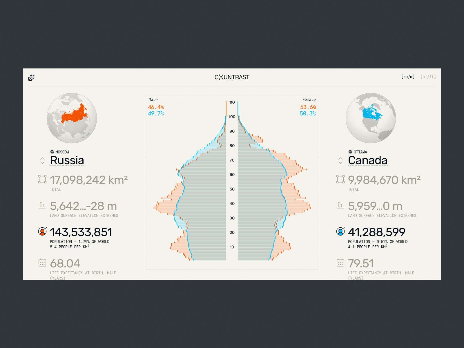 Explore and compare countries around the world. Discover differences in population size, land and water area, density, and more through interactive visualizations and data insights