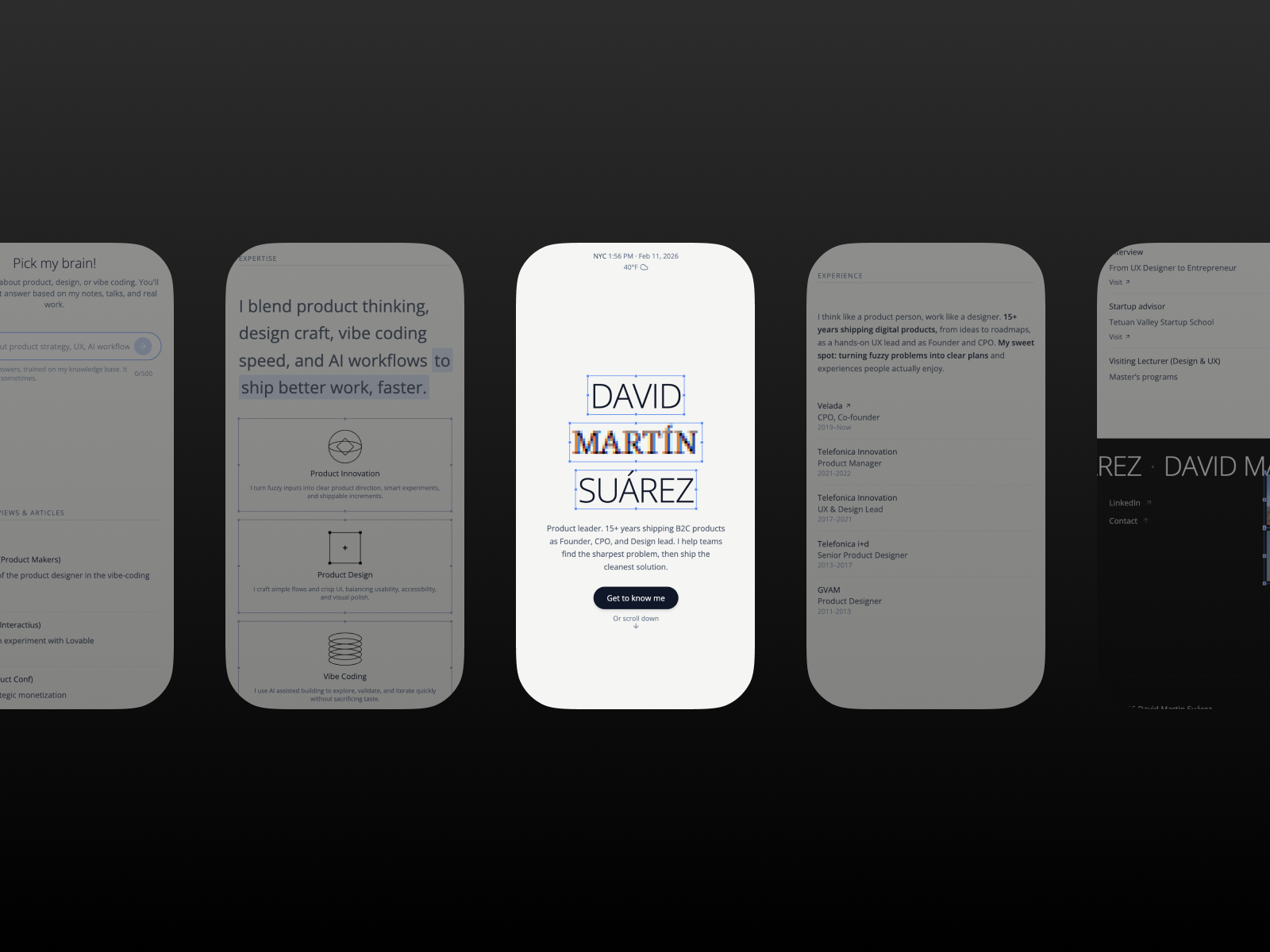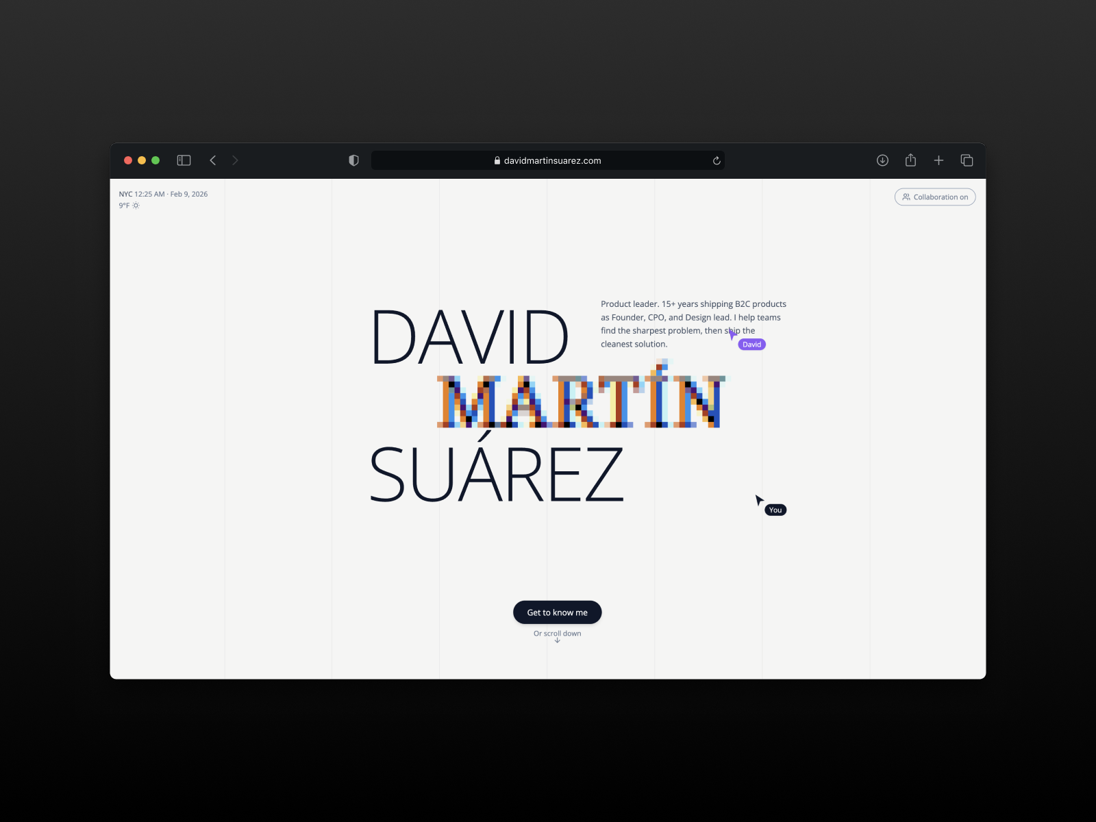 Personal portfolio designed as an interactive design canvas: draggable elements, visible guides, a collaborator cursor, and an AI chat trained on my work and design process.