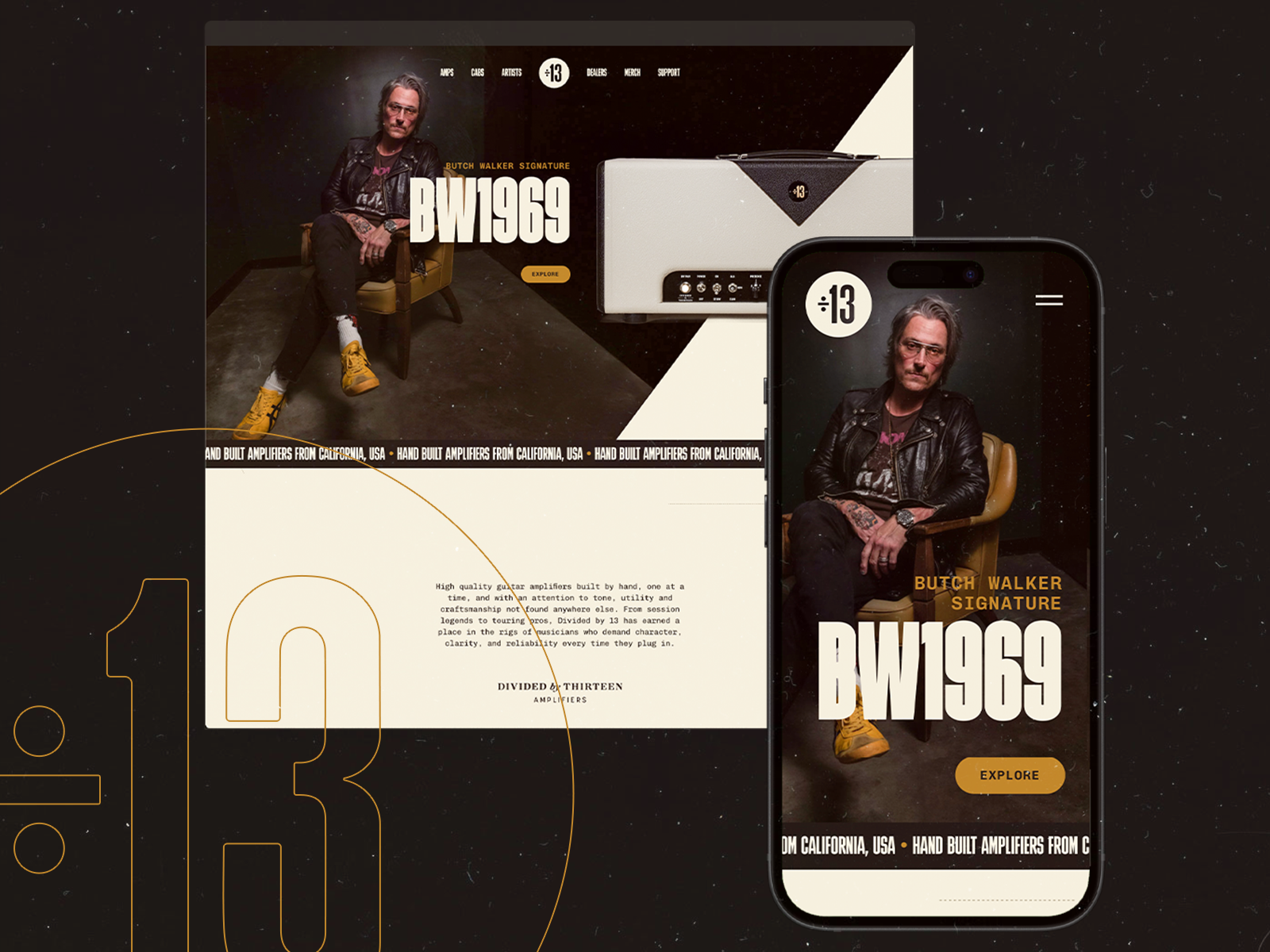 An interactive, monochrome-driven site celebrating Divided by 13’s handmade guitar amplifiers—where design, motion, and attitude amplify the brand story.