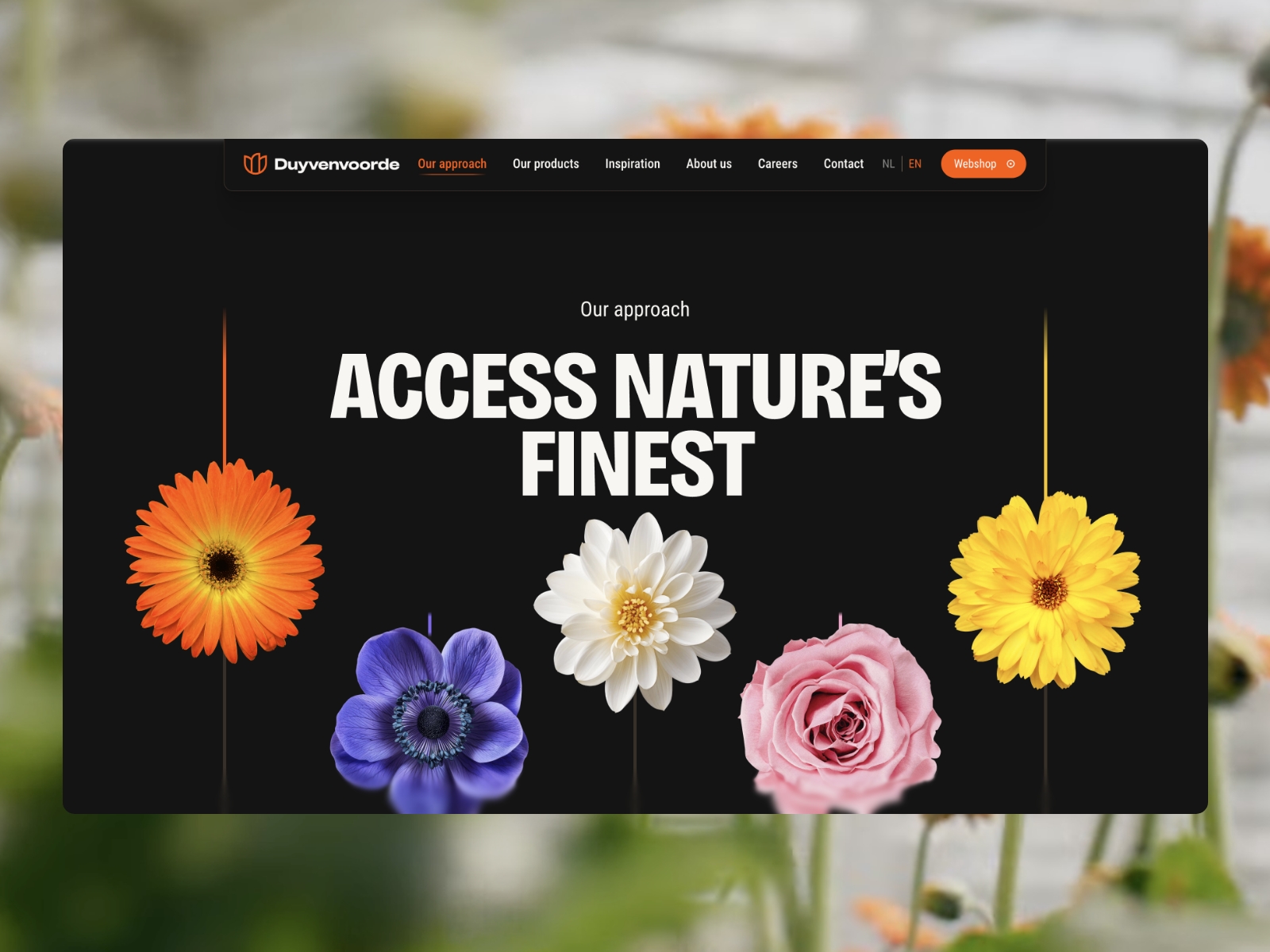 A dynamic corporate website for Duyvenvoorde where flowing lines capture movement in flower trade and logistics. Blending creativity, precision and connection into a visual experience.