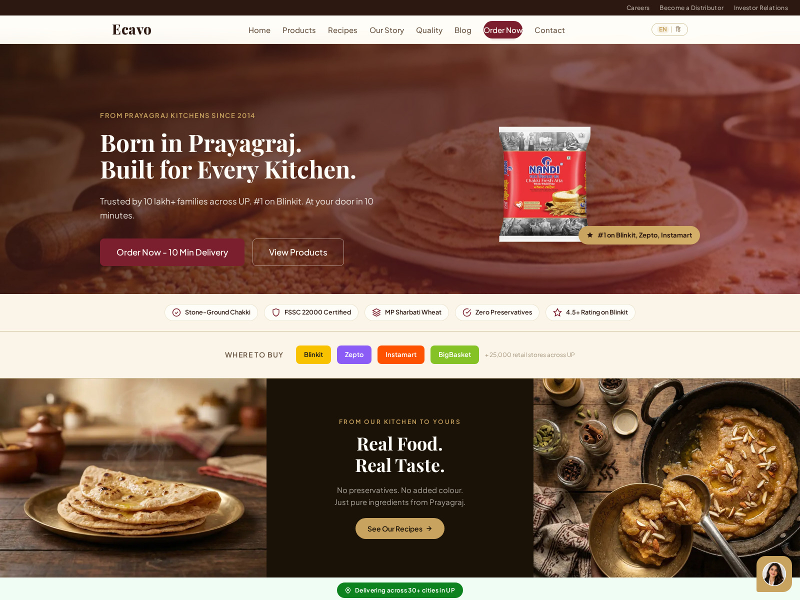 Ecavo is a Prayagraj-based FMCG brand behind Nandi Atta, India's #1 atta on Blinkit. Available on Blinkit, Zepto, Instamart, and BigBasket with 10-minute delivery across UP.