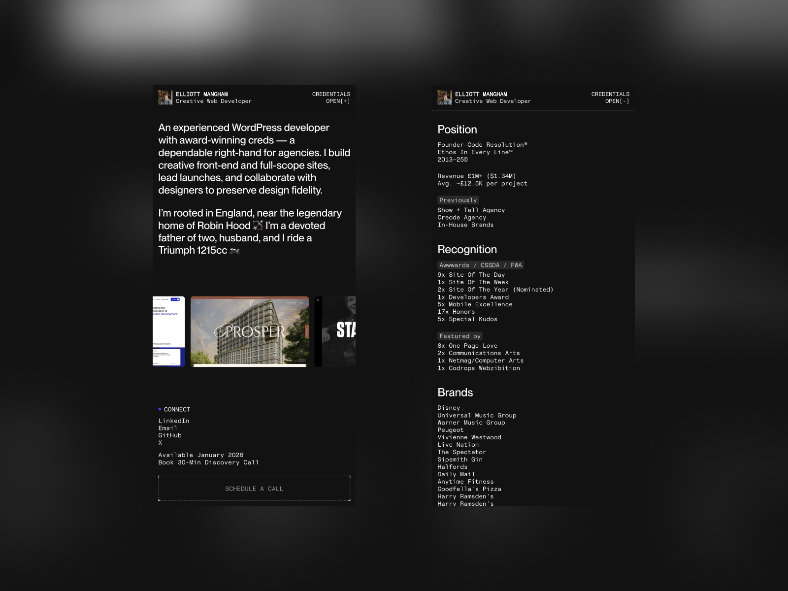 Meet Elliott Mangham, the creative developer behind seamless WordPress sites. With 10 Site of the Day awards and 2 nominations for Site of the Year, his portfolio speaks volumes.