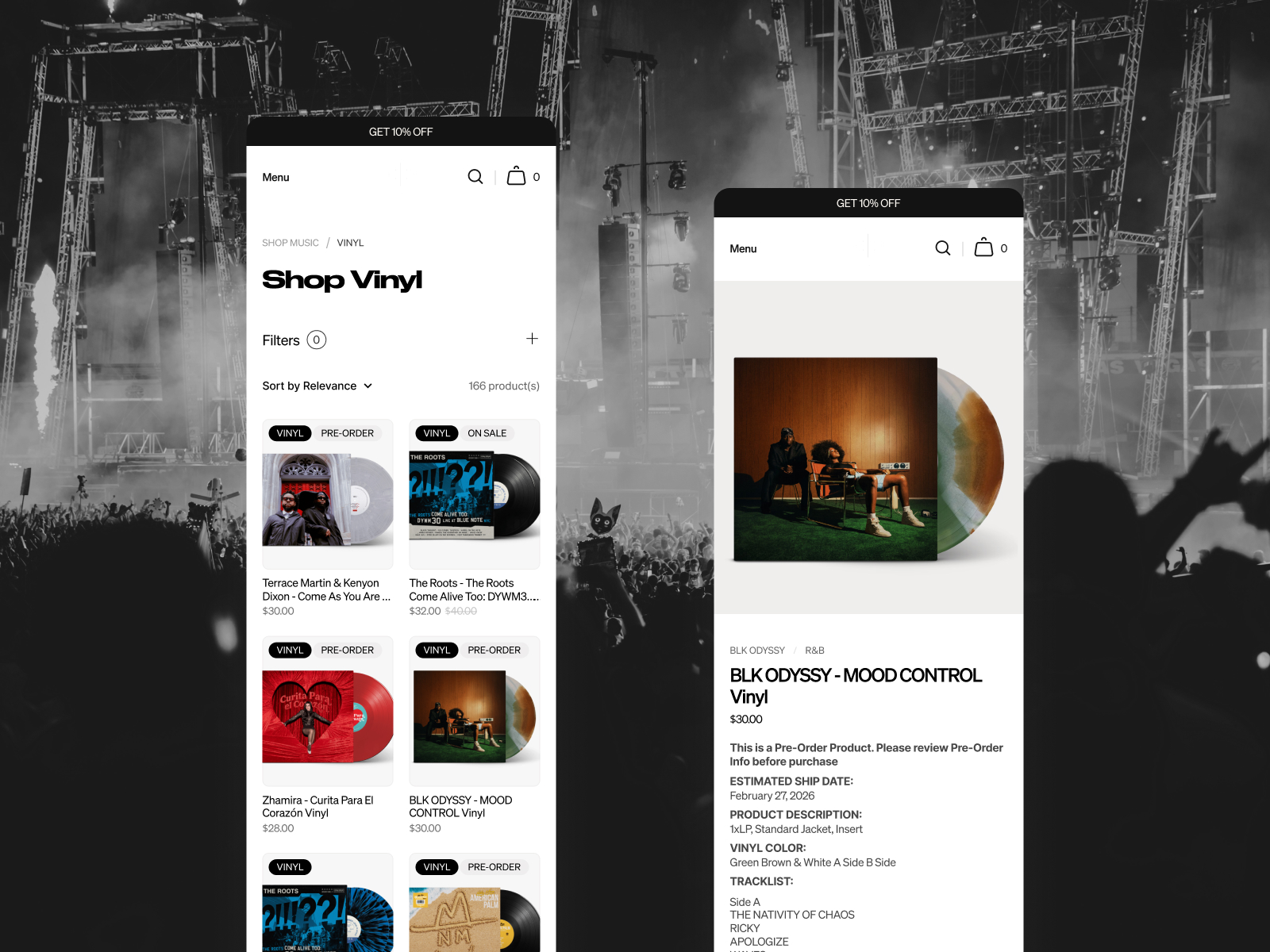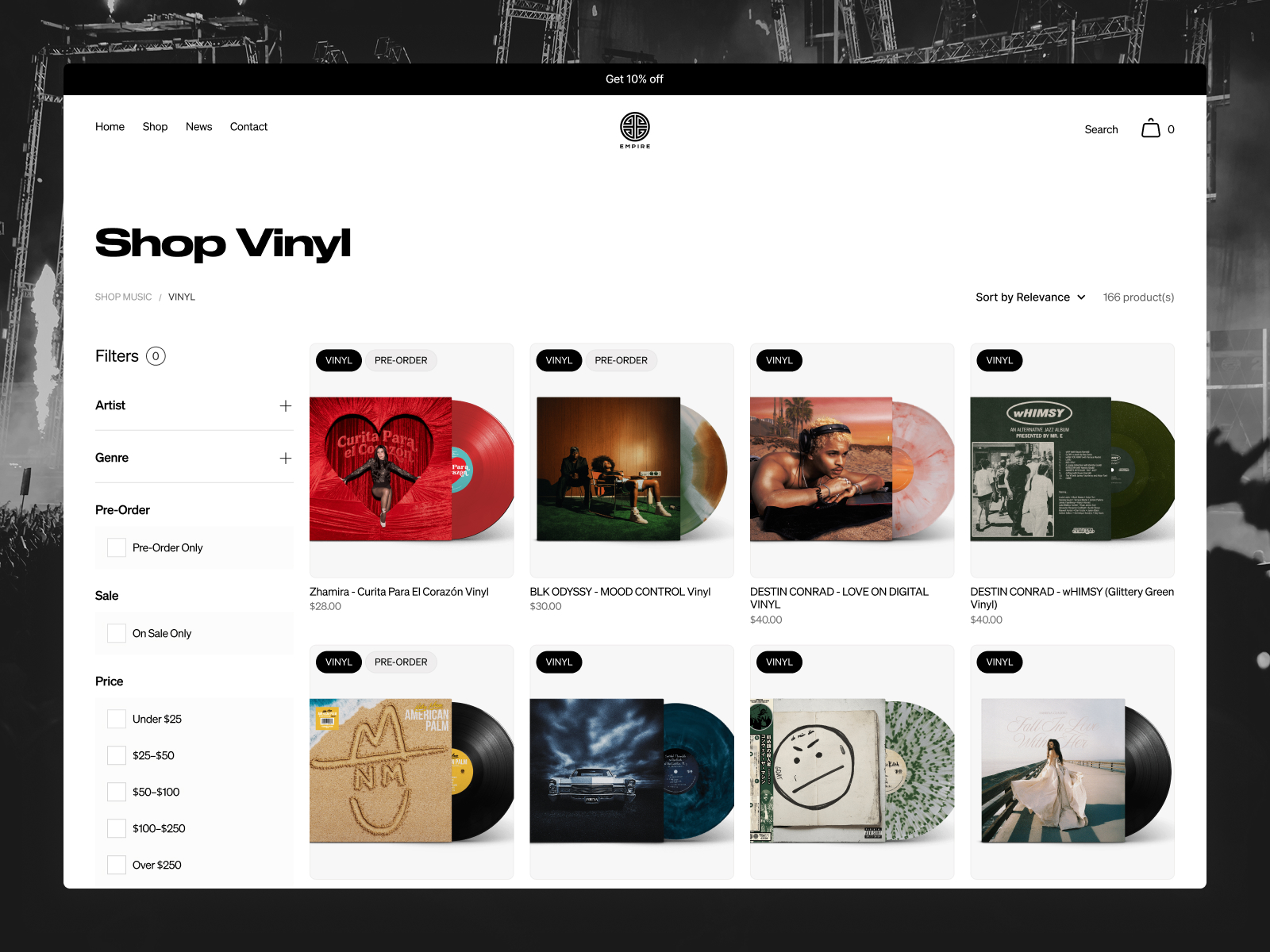 This is the e-commerce website for EMPIRE, a global music distributor and independent label, built in Framer with a custom, CMS-driven frontend connected to Shopify via Framer Commerce.