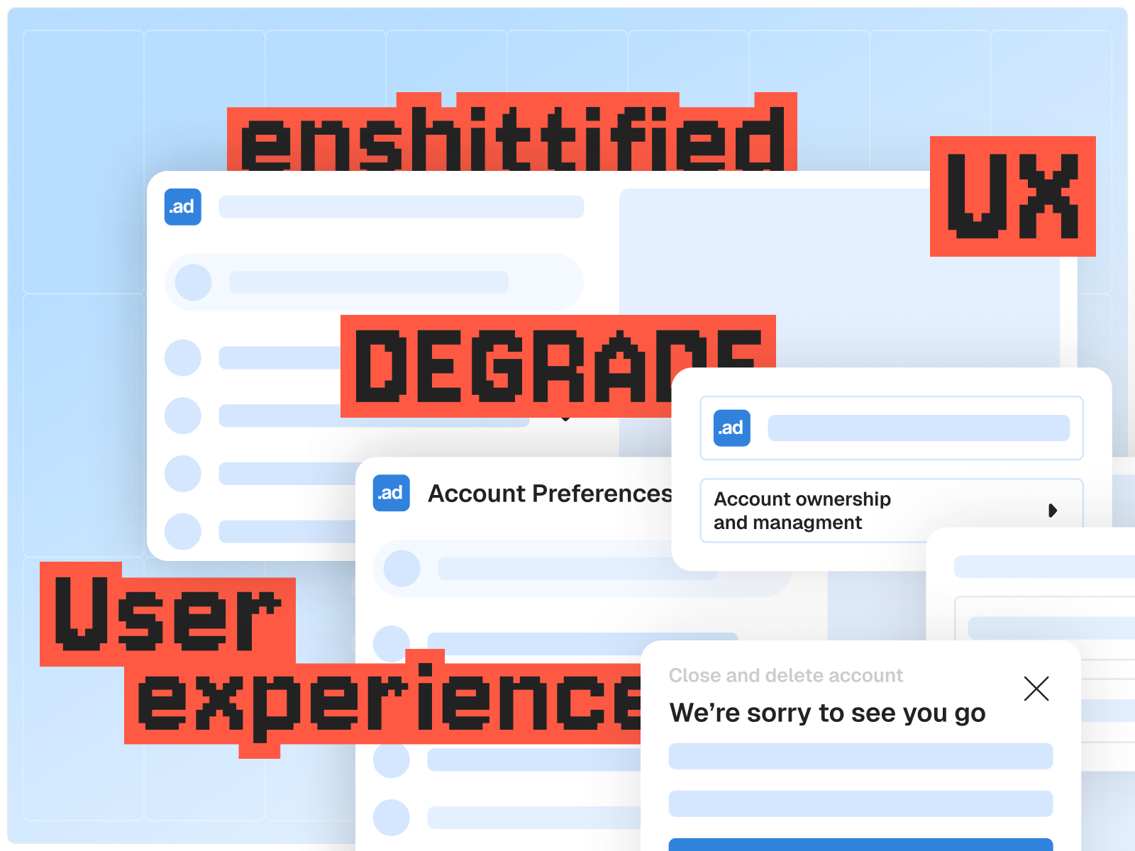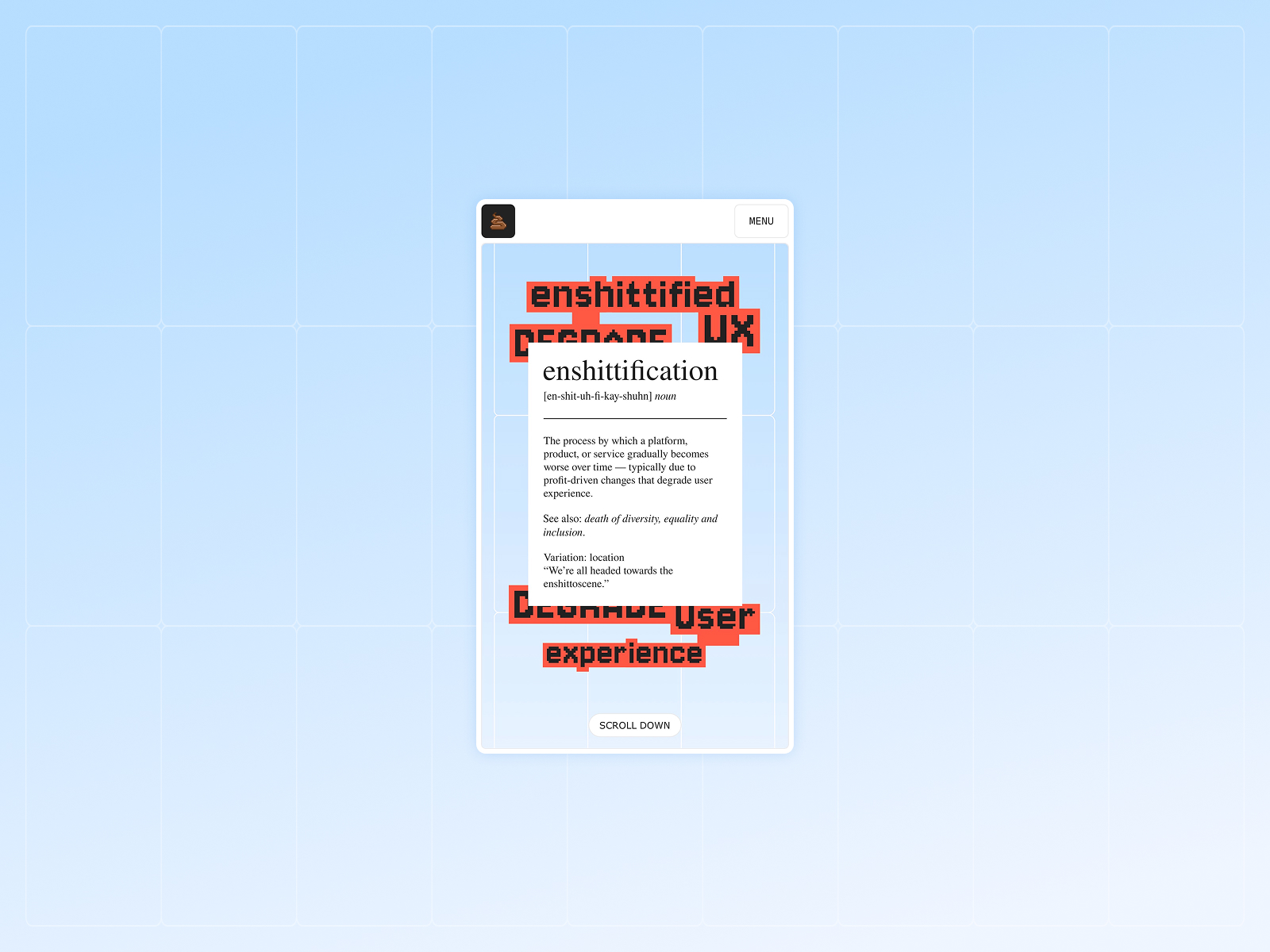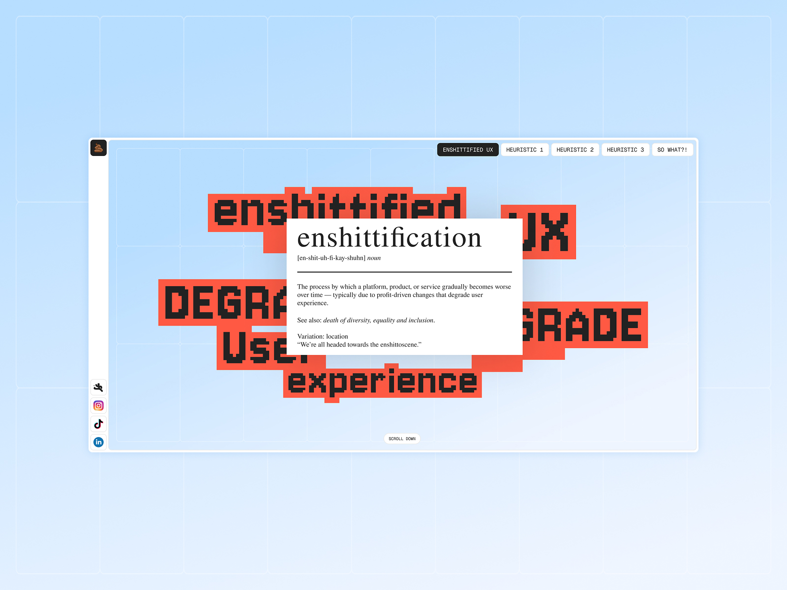 Through fictional scenarios, enSHITtified UX explores platform UX heuristics and how design patterns erode as products optimize for retention and growth.
