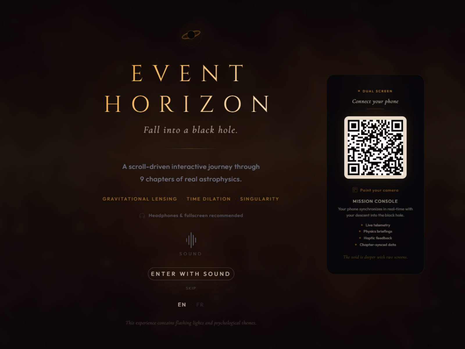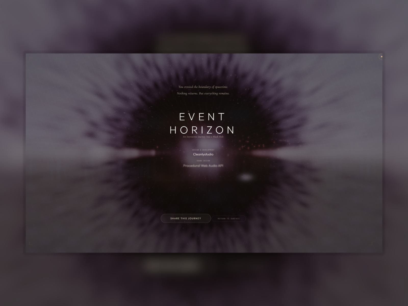An immersive WebGL journey into a black hole. Features custom GLSL shaders, cross-device mobile sync, and a hidden psychological time loop. Don't return to the surface.