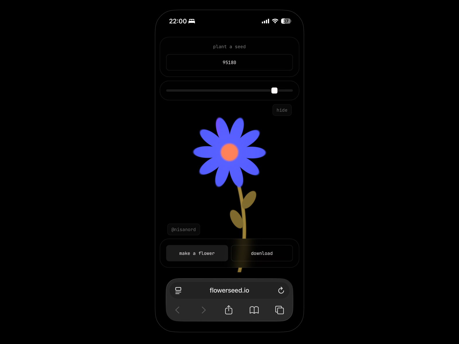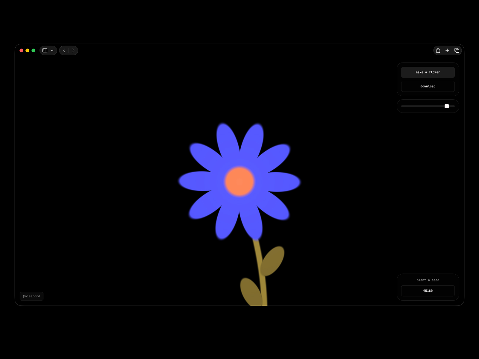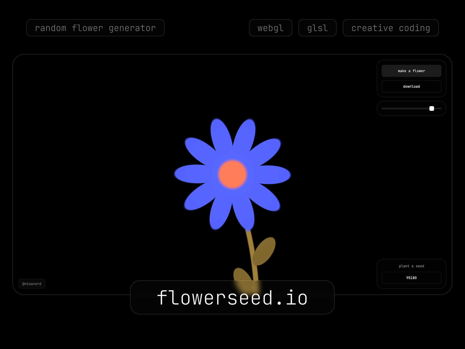 Flowerseed is a random flower generator, made with WebGL shaders. Each bloom is grown from math, and a little bit of chaos ~