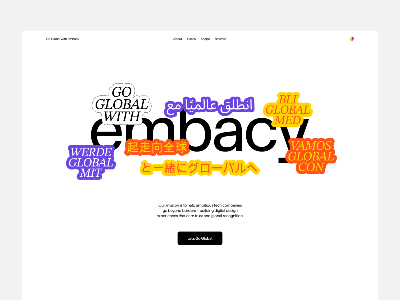 A website presenting Go Global with Embacy, showcasing how we help ambitious tech companies go beyond borders through digital design that earns trust and global recognition.