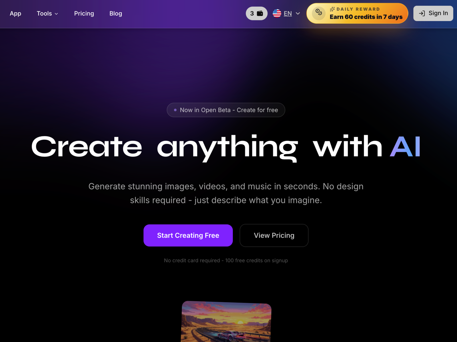 Create AI images, videos, and music in one fast workspace. Generate from text, guide with references, and move from idea to asset in minutes.