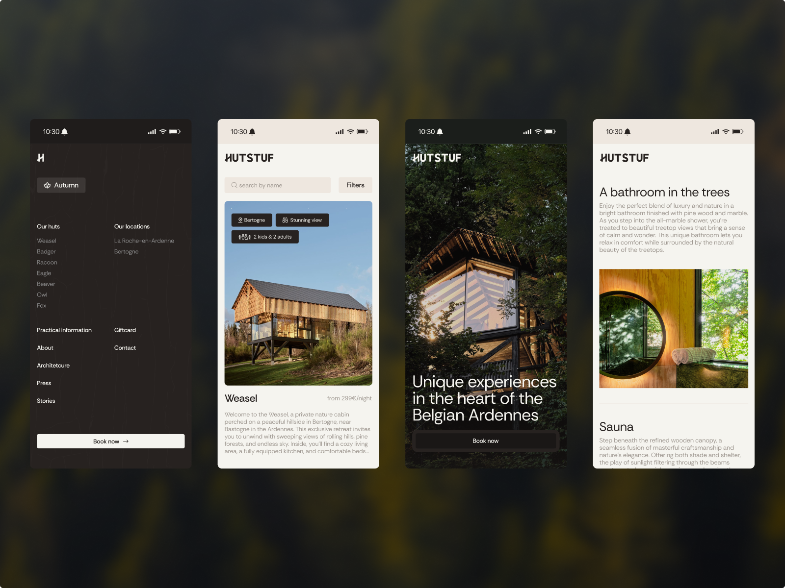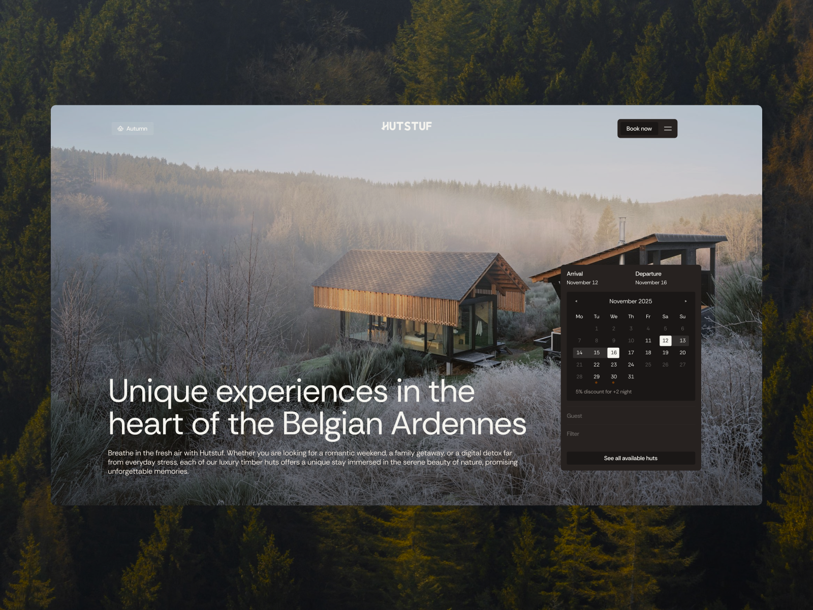 Hutstuf offers high-end, architect-designed cabins in the Belgian Ardennes. They blend sustainable luxury with nature, featuring minimalist timber designs and serene forest views.