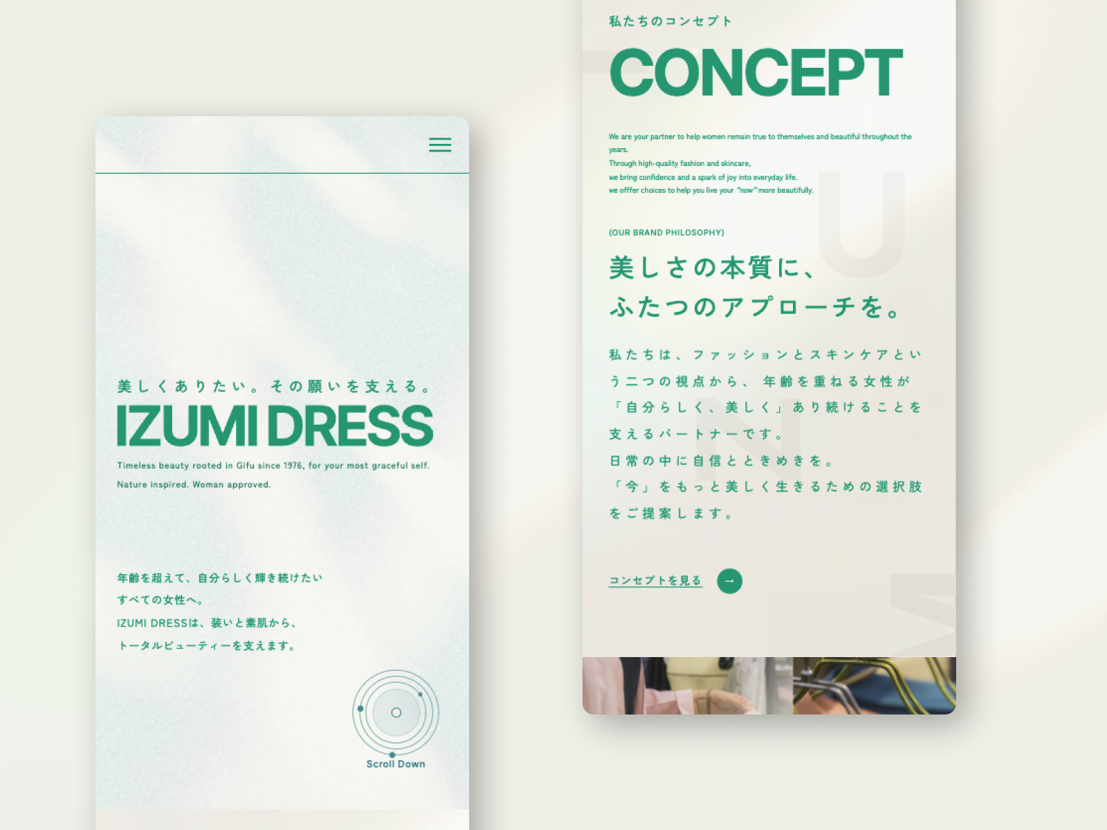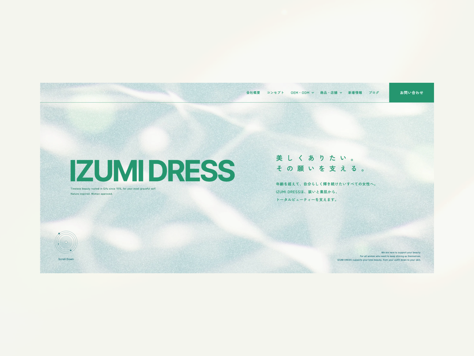 Izumi Dress, founded in 1976 in Gifu, is a womenswear maker providing OEM/ODM and its own apparel and skincare brands, supporting women who want to keep shining at every age.