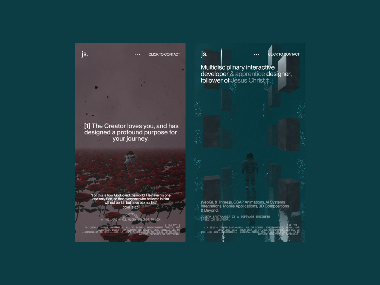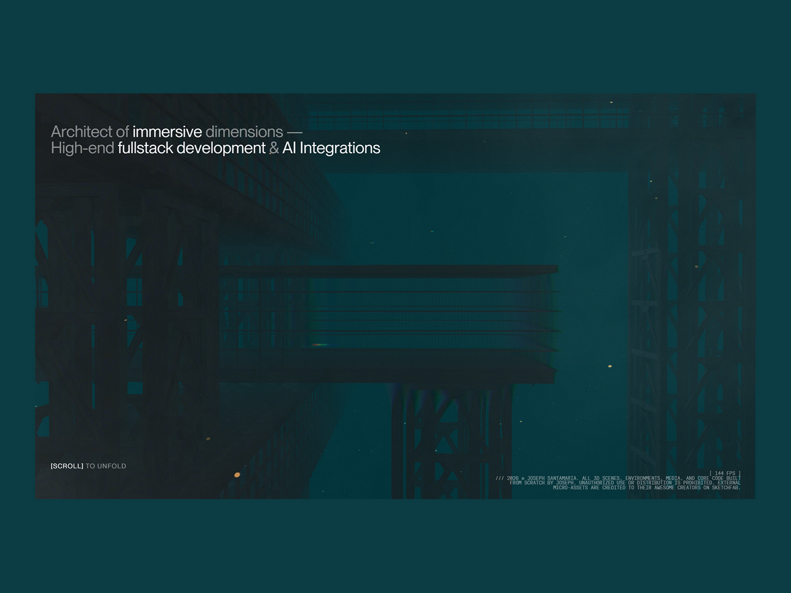 An interactive 3D environment serving as my professional footprint. Pure web performance, immersive design, and absolute purpose. Built from Ecuador.