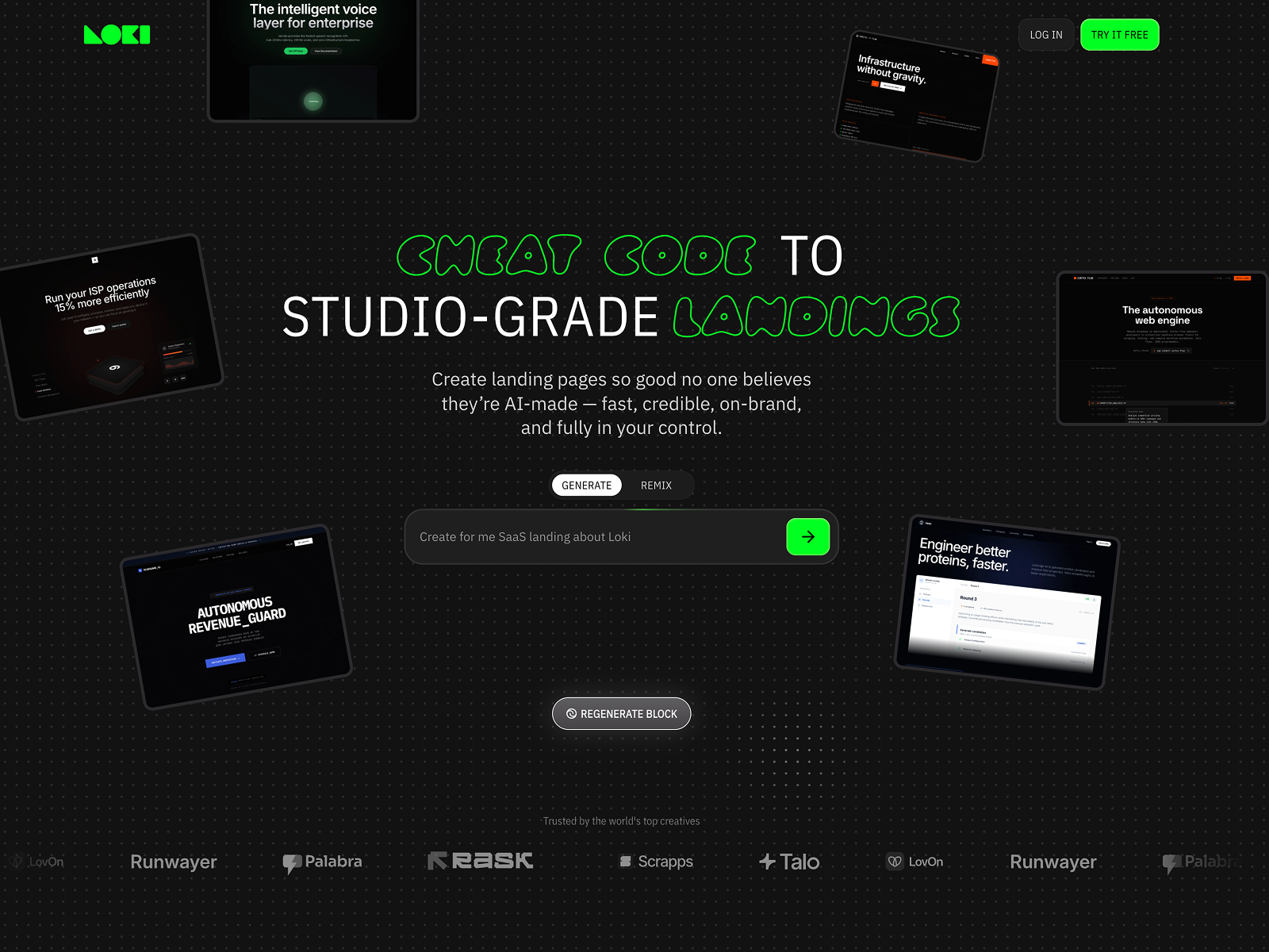 Loki Build is an AI-native Website Builder for shipping studio-grade landings. The site showcases how to generate, edit, remix, and publish high-quality web experiences.