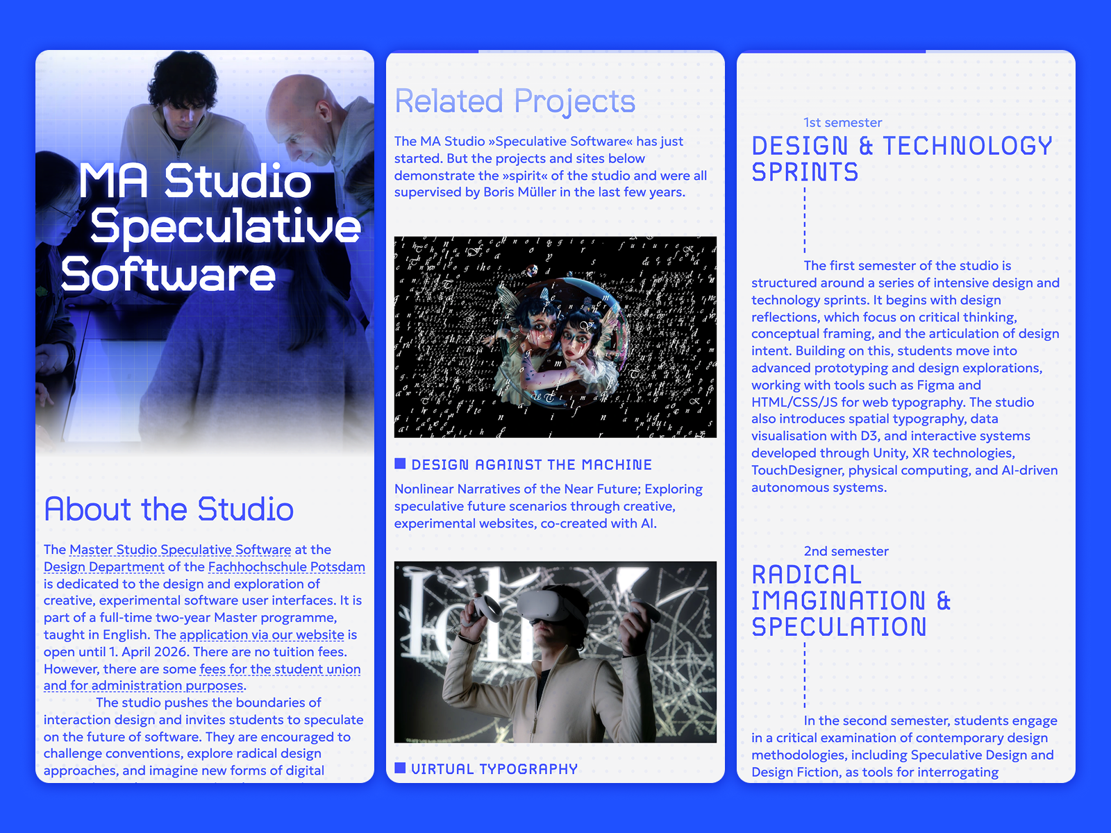 The Master Studio Speculative Software is dedicated to the design and exploration of creative, experimental software user interfaces.