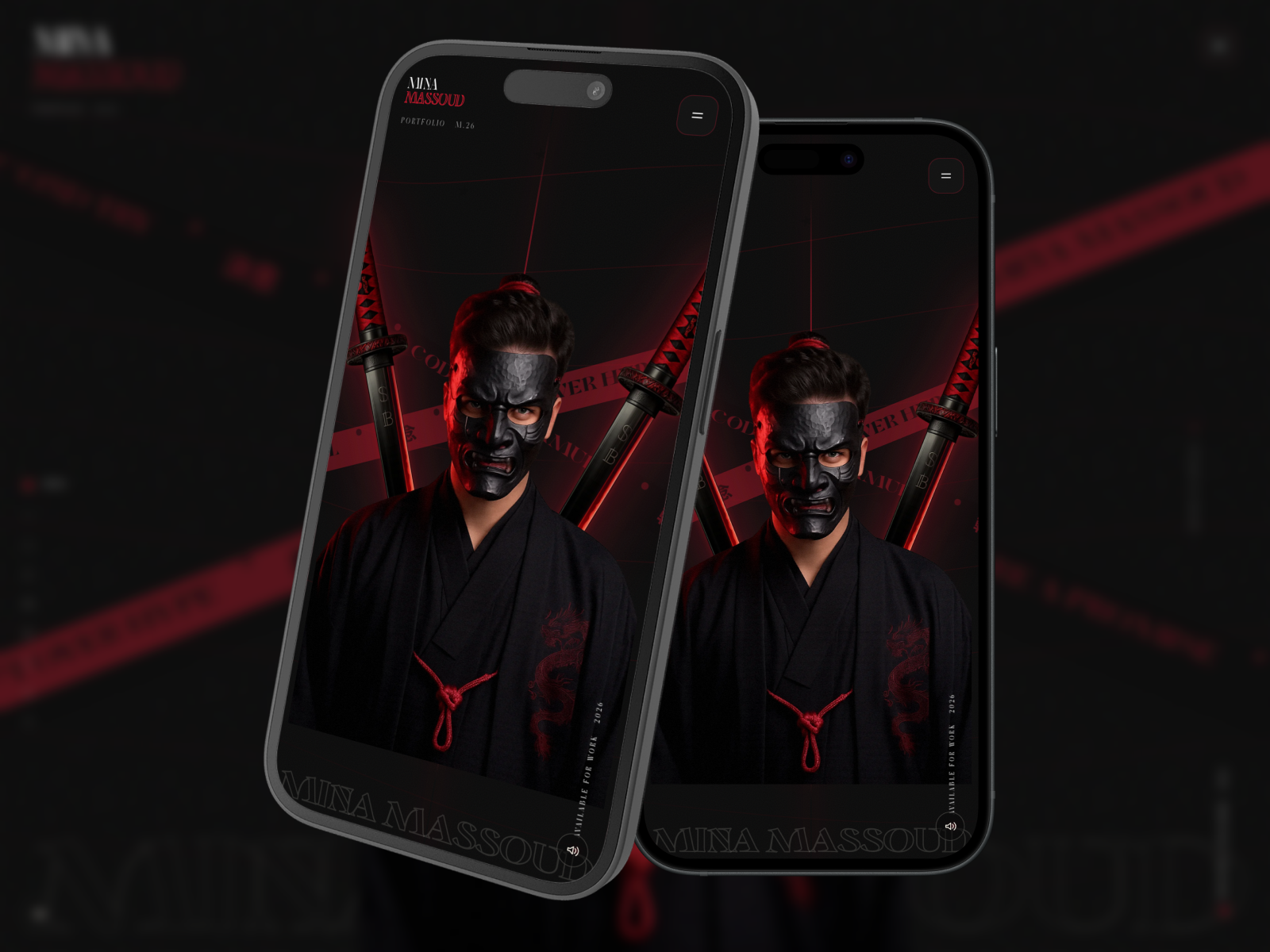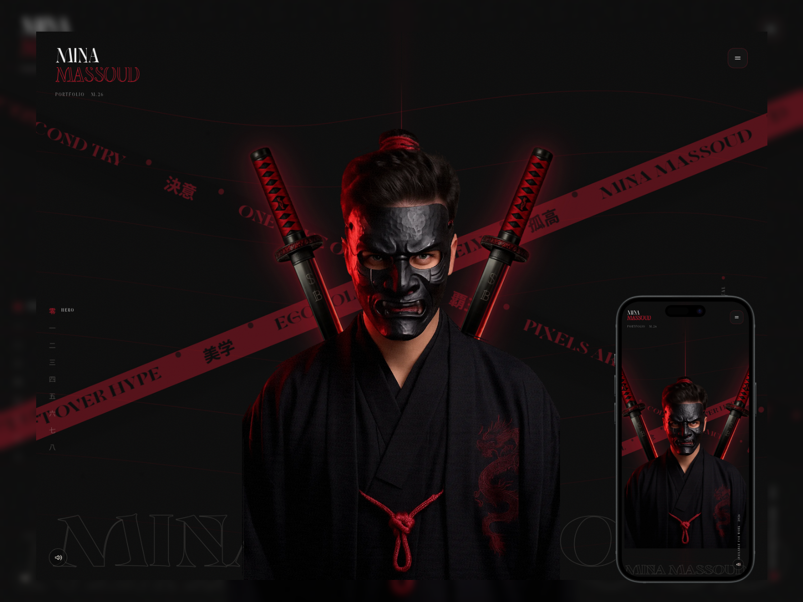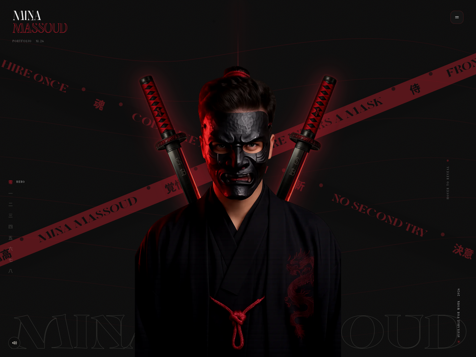 An editorial portfolio for frontend engineer Mina Massoud, channeling samurai discipline through chaptered storytelling, split-face interactions, and craft as precise as the blade.