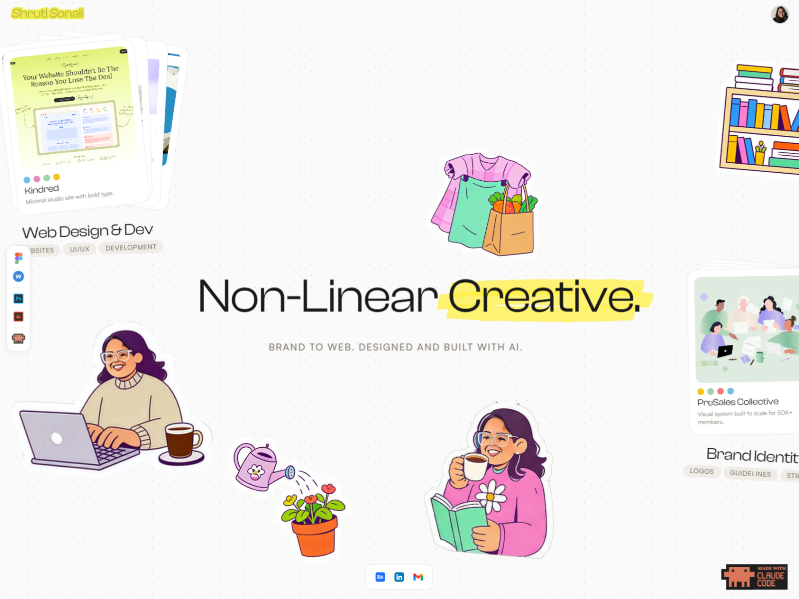 A brand and web design portfolio built without Figma — no wireframes, no design tools. Just a mood board, Claude Code, and pure creative instinct.