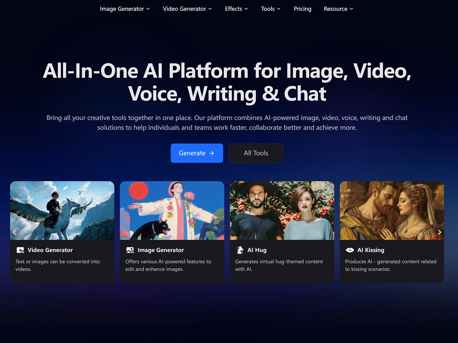 Your all-in-one AI creation suite for generating stunning visuals, from AI-generated images to intelligent video content. Whether you're a designer, marketer, or content creator.