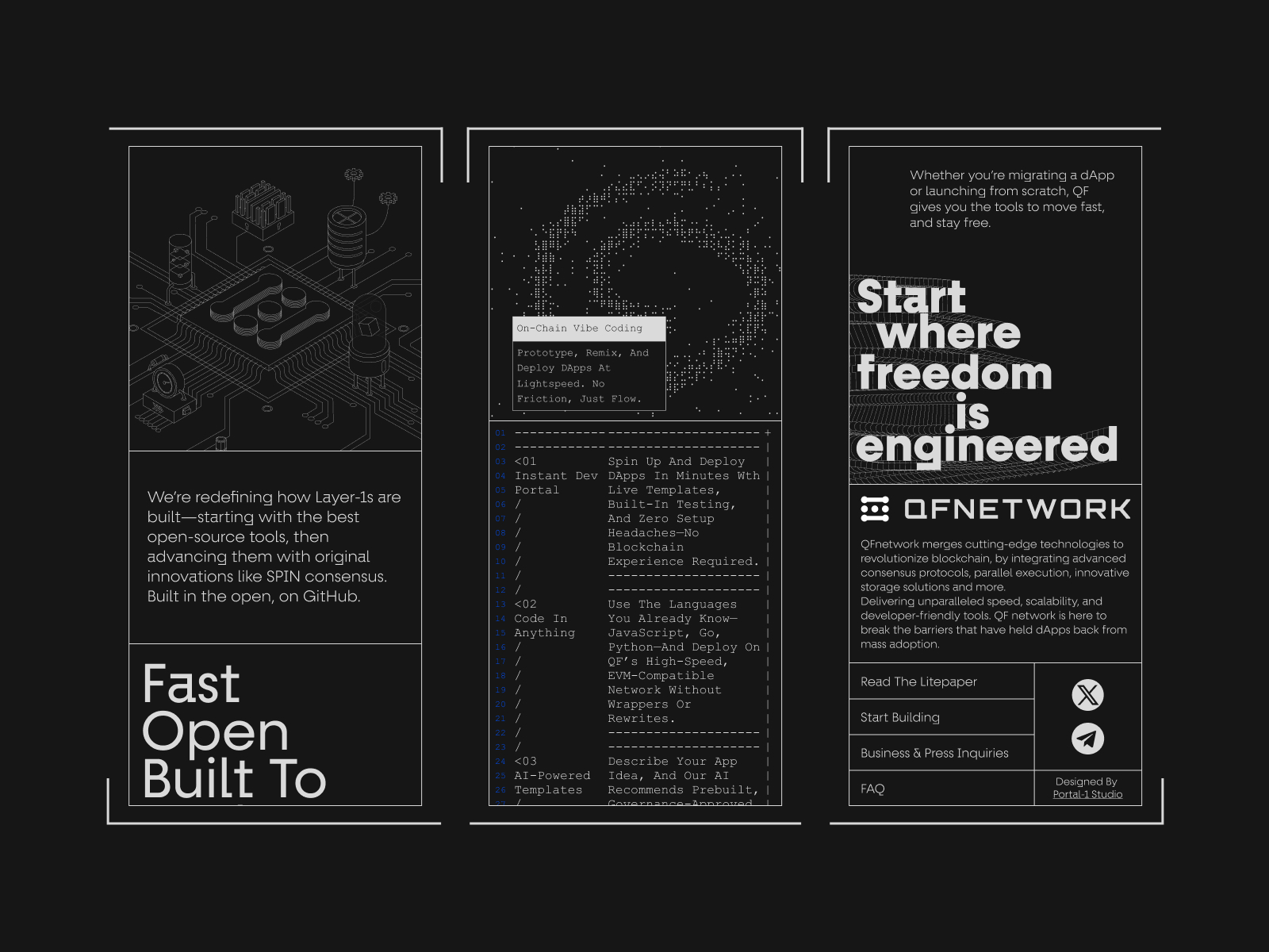 A bold landing page and visual identity for QF Network; a sovereign blockchain platform built to power digital freedom with speed, scalability, and clarity.