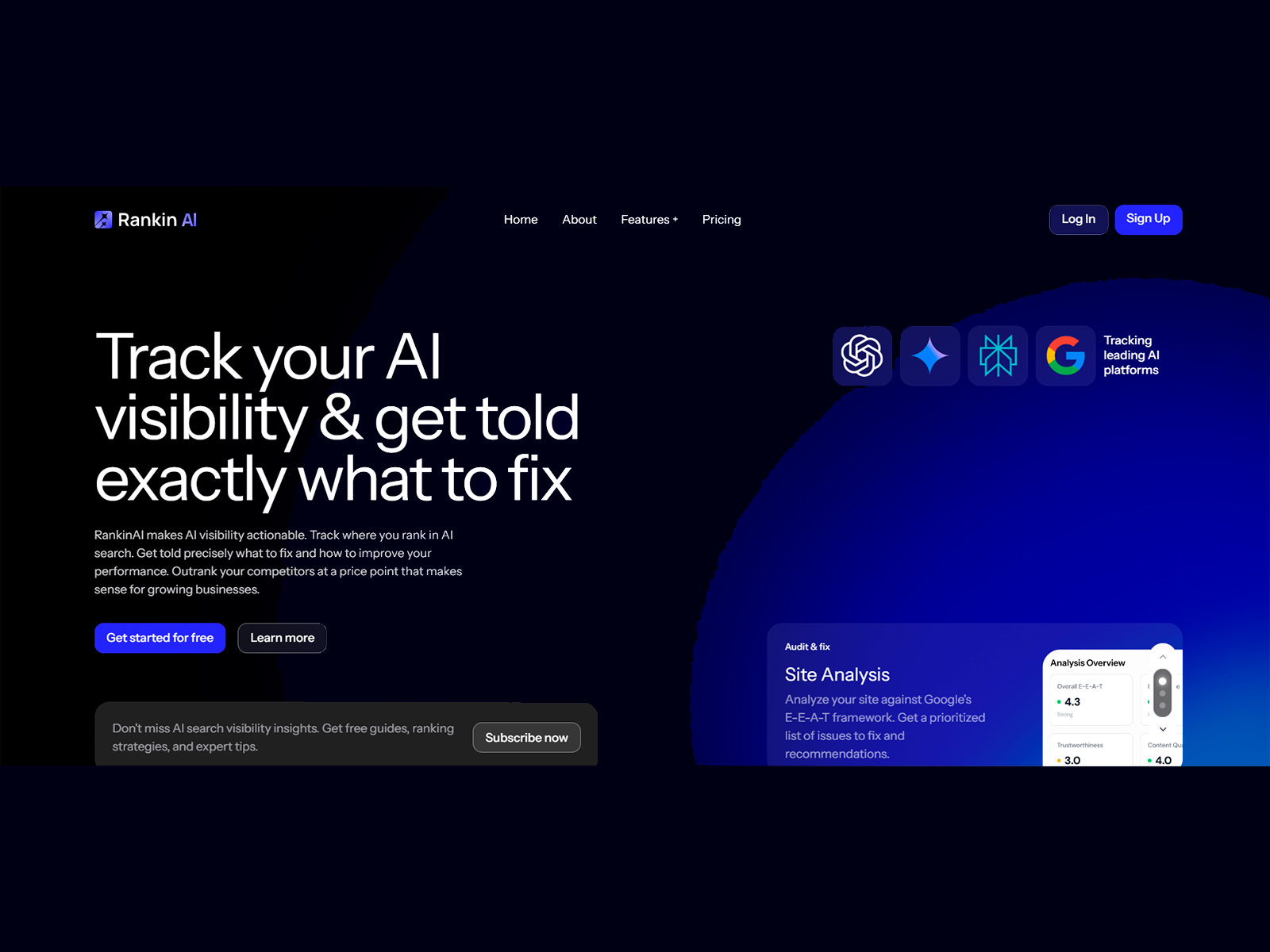 RankinAI helps companies track and improve how their websites appear in AI-powered search answers through insights, audits, and prioritized recommendations.