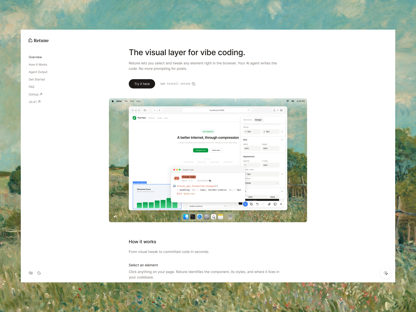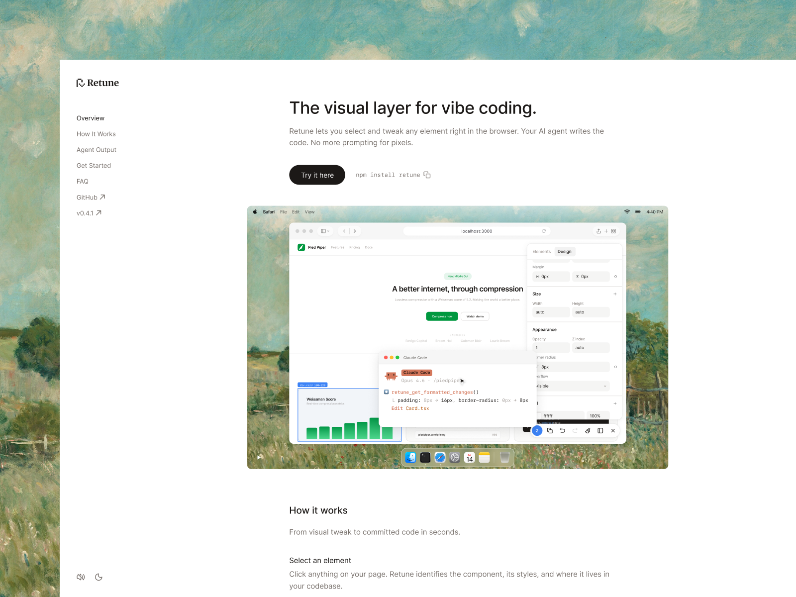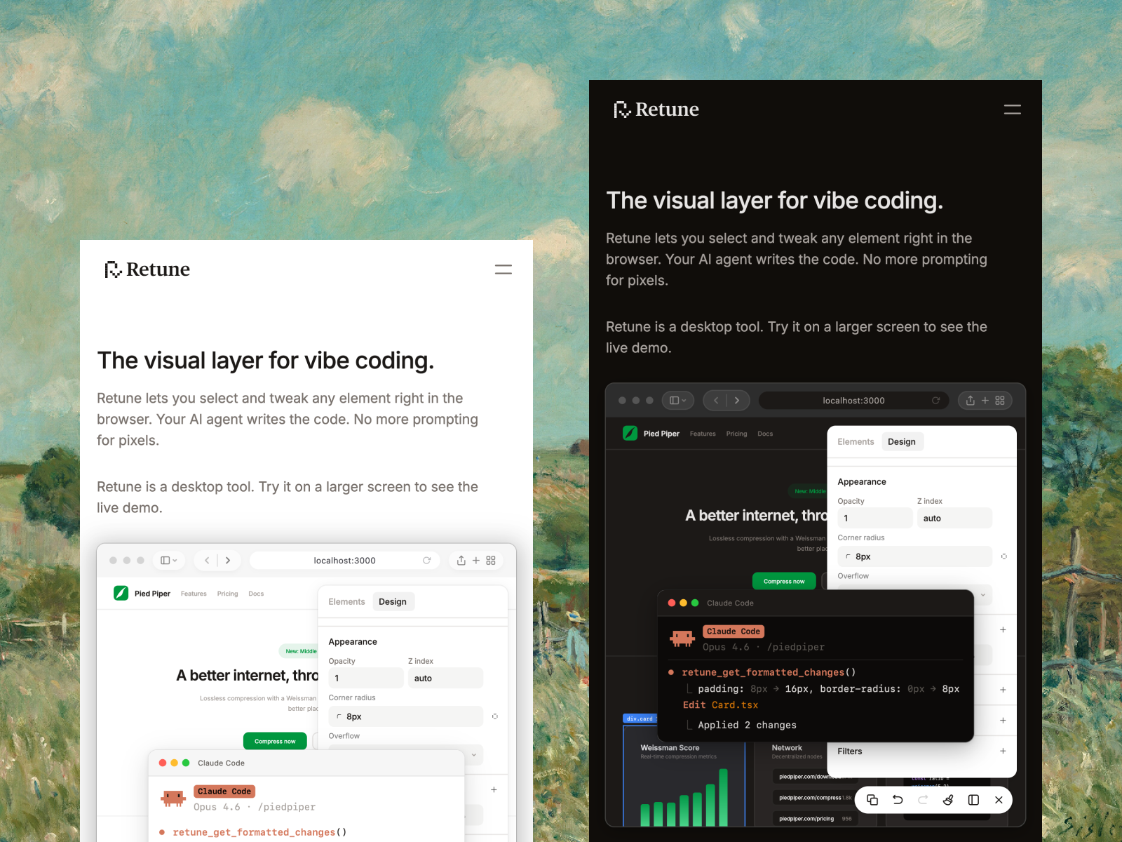 Retune is the visual layer for vibe coding. Retune lets you select and tweak any element right in the browser. Your AI agent writes the code. No more prompting for pixels.