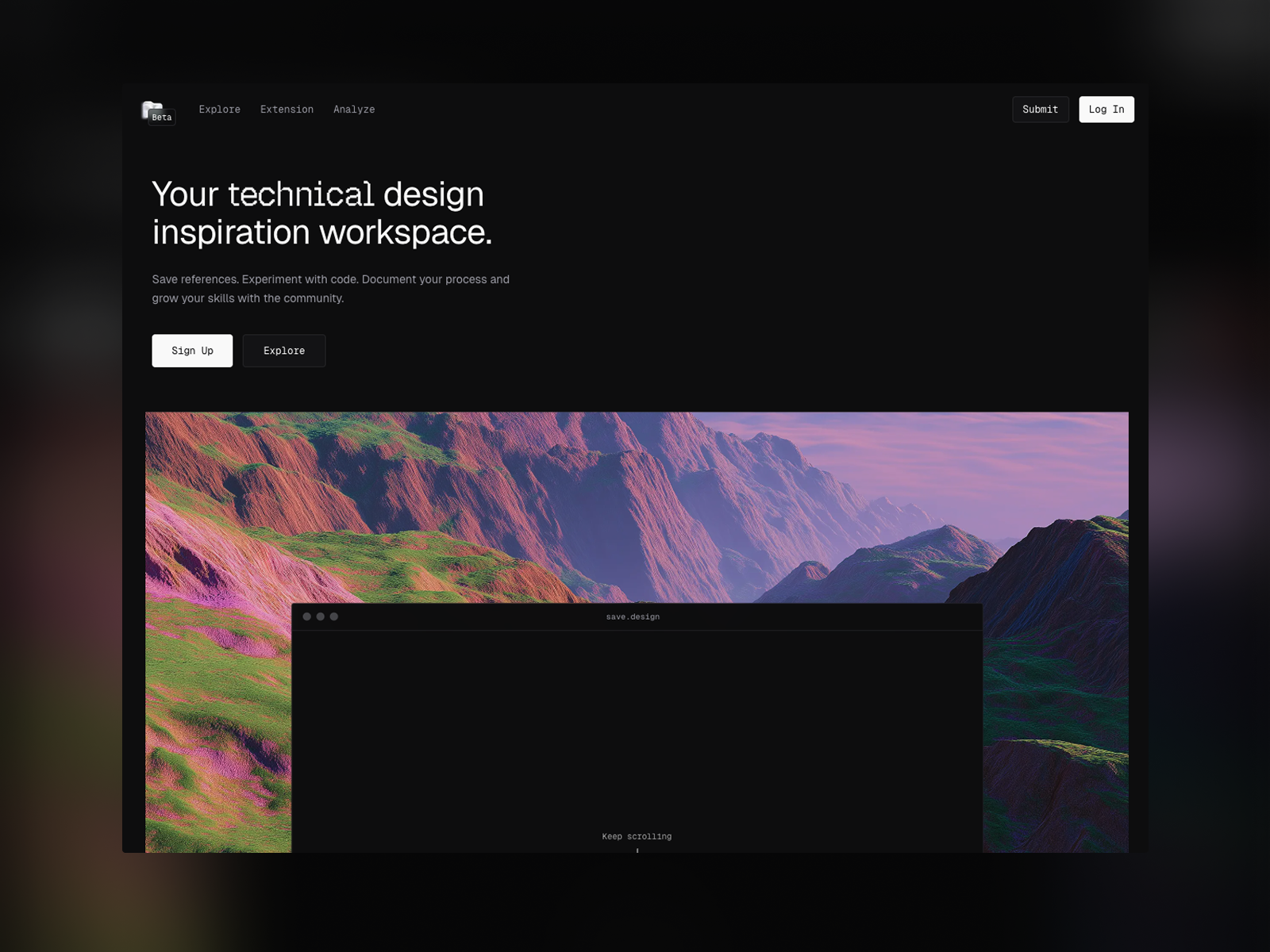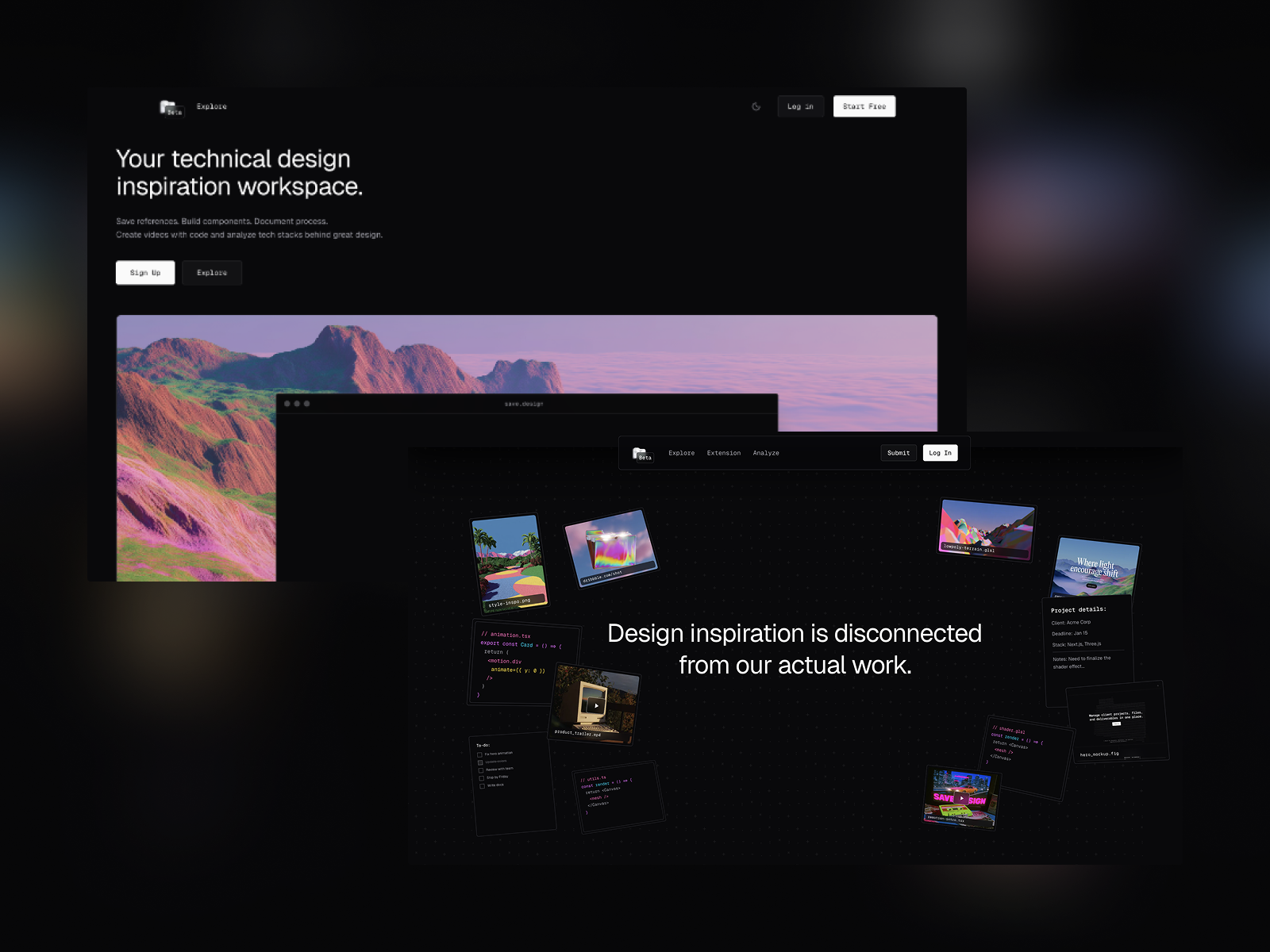 A platform for designers and developers to find inspiration with tech insights, organize findings, code live, collaborate, and share findings with the community.