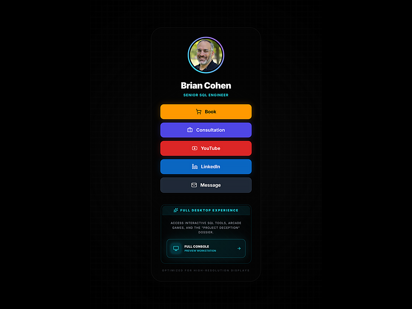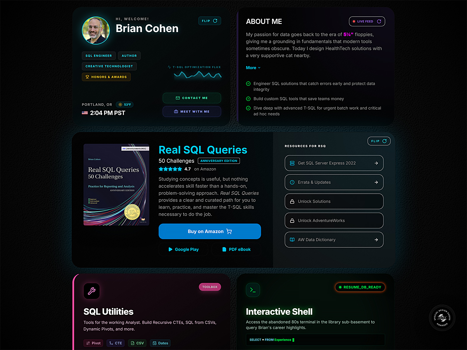 A midnight night drive at the analog-digital divide. Inspired by Rush's "Signals," this 80s dashboard features T-SQL utilities, arcade puzzles, and a cinematic audio thriller.
