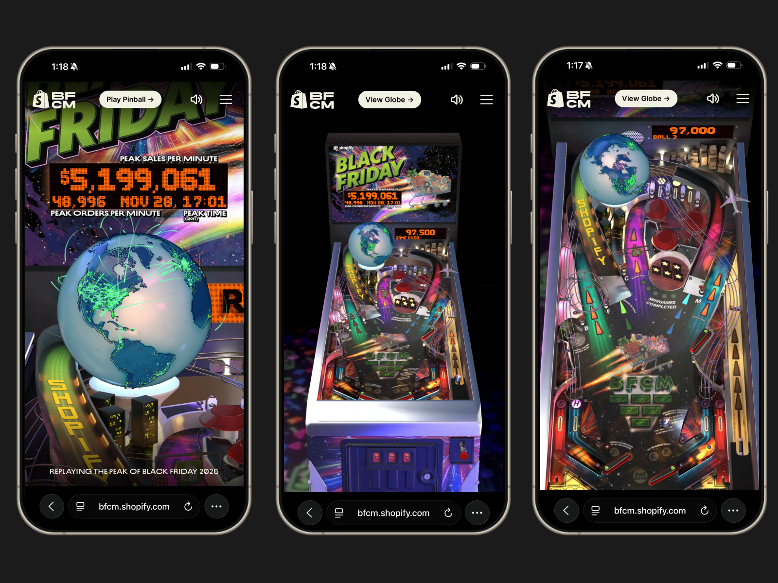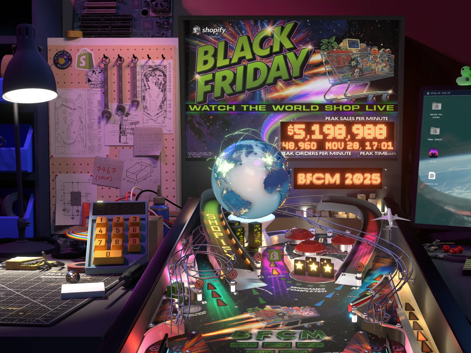 An interactive 3D scene showing realtime sales on Shopify during the Black Friday 2025 weekend.Features a full pinball game playable on desktop, mobile and VR.