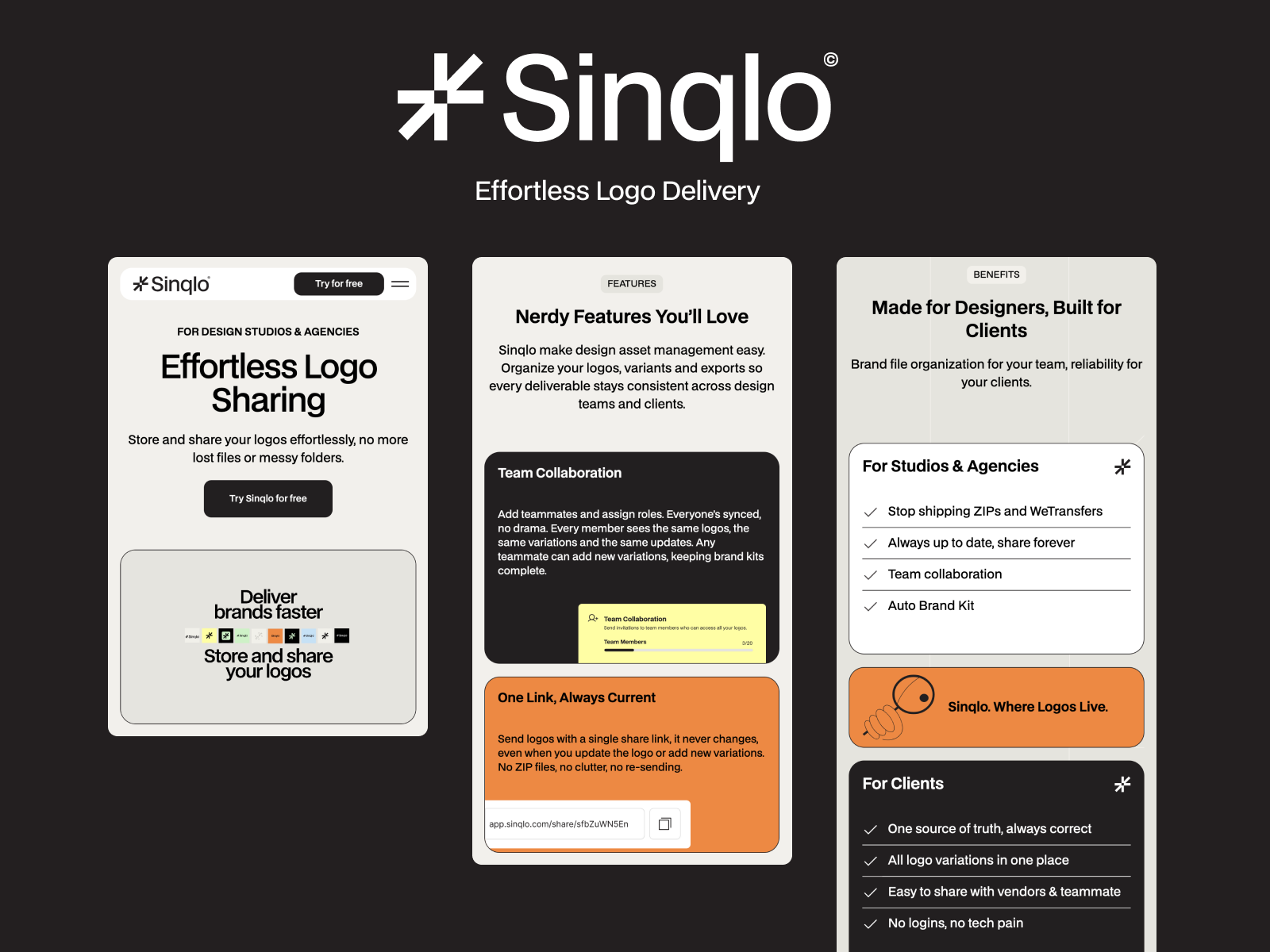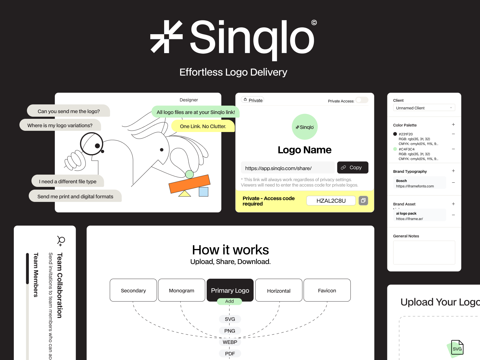 Sinqlo streamlines logo delivery for design studios with automated brand ready exports and a lifetime share link that keeps every file organized, updated and instantly accessible.