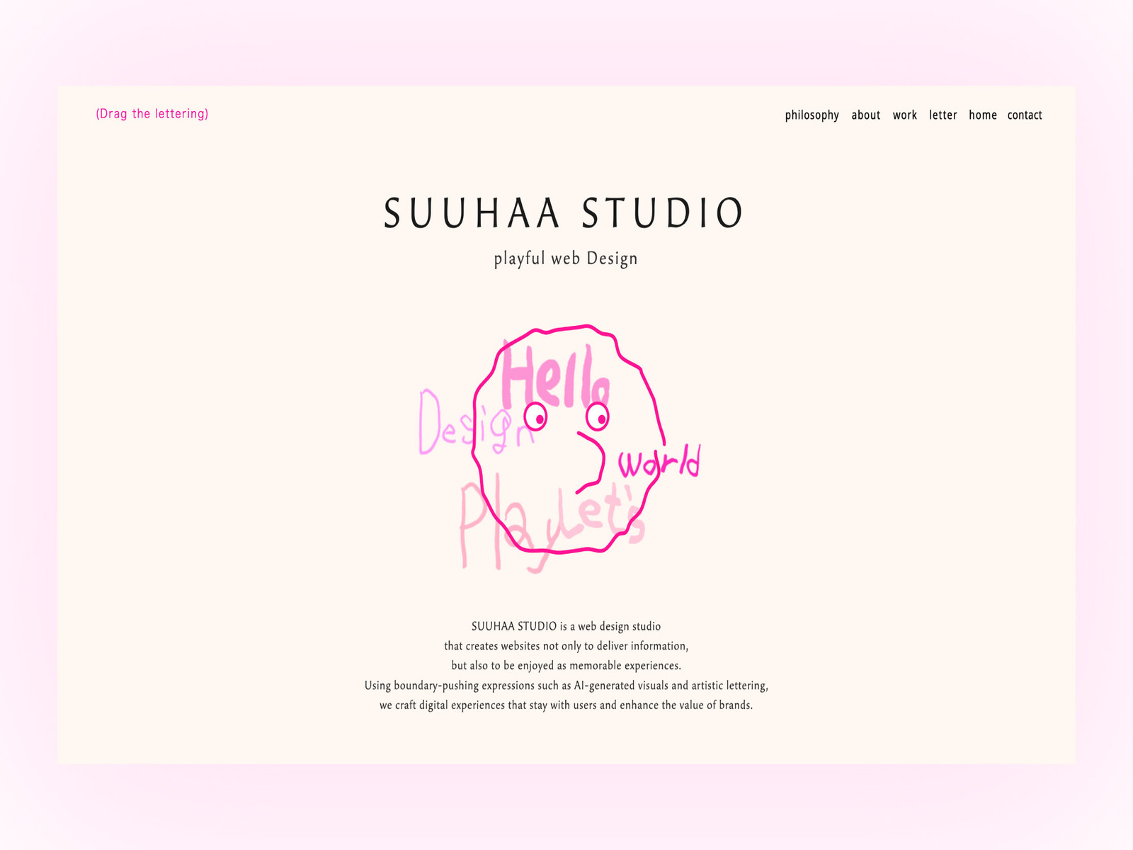 90% minimalism meets 10% surrealism. Not explanation, but experience. Navigation text prompts different interactions, creating playful, memorable web journeys.