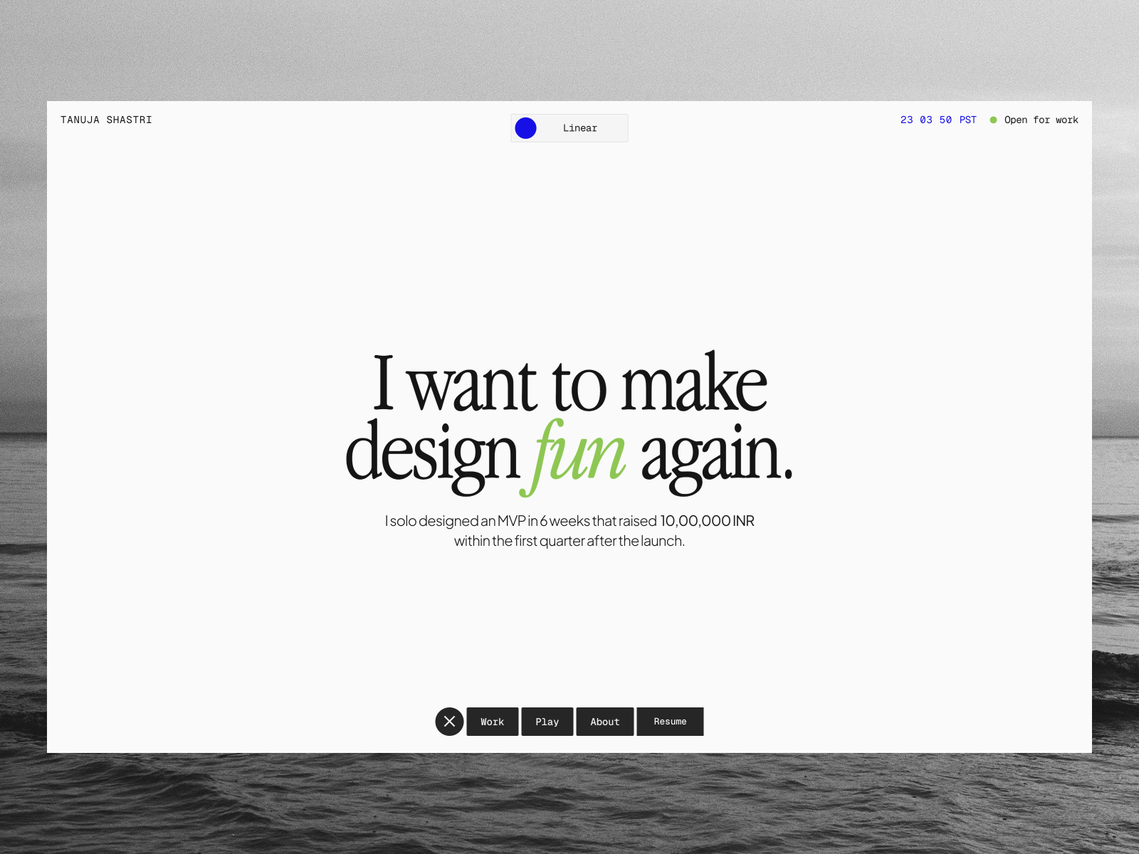 Strong type, intentional color, and interactions that know when to show up and when to get out of the way. You'll find 0→1 products, AI-first workflows, and design systems built from scratch. Nothing here is filler.