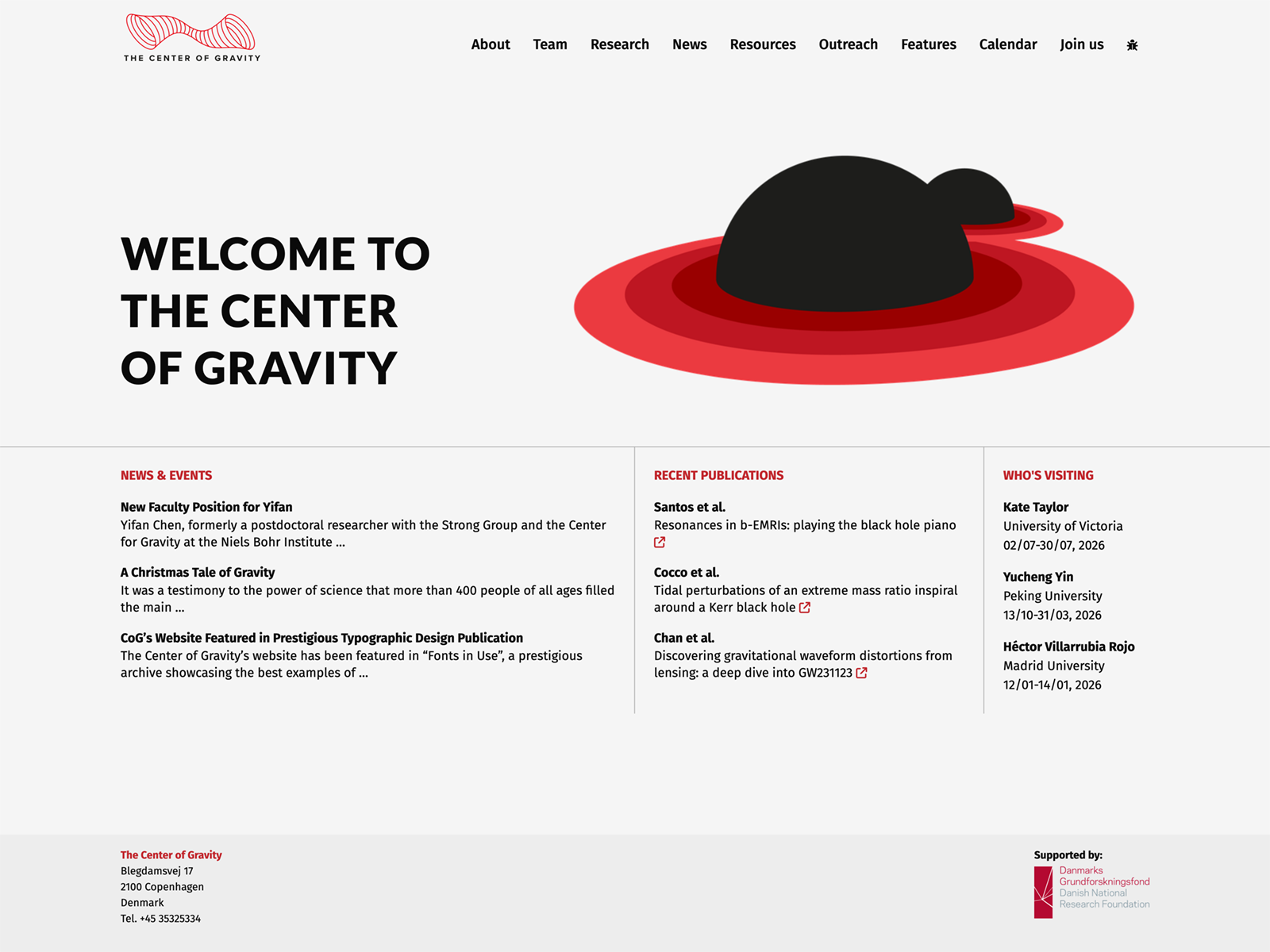 The Center of Gravity (CoG) is a newly formed DNRF Center of Excellence at the Niels Bohr Institute in Copenhagen. The Center focuses on the understanding of gravity: what lies within black holes, how do they move or behave dynamically, how they are affected by matter and quantum effects, and what information can we gain via gravitational waves. CoG is perhaps the largest and most active Center in the field in Europe.From its conception, the website was designed with a dual mission in mind: to be a rigorous resource for the professional physics community while also providing the general public with a place to access the Center’s research and work in a clear and engaging manner. These requirements dictated not only the visual language of the website but also the choice of fonts.
