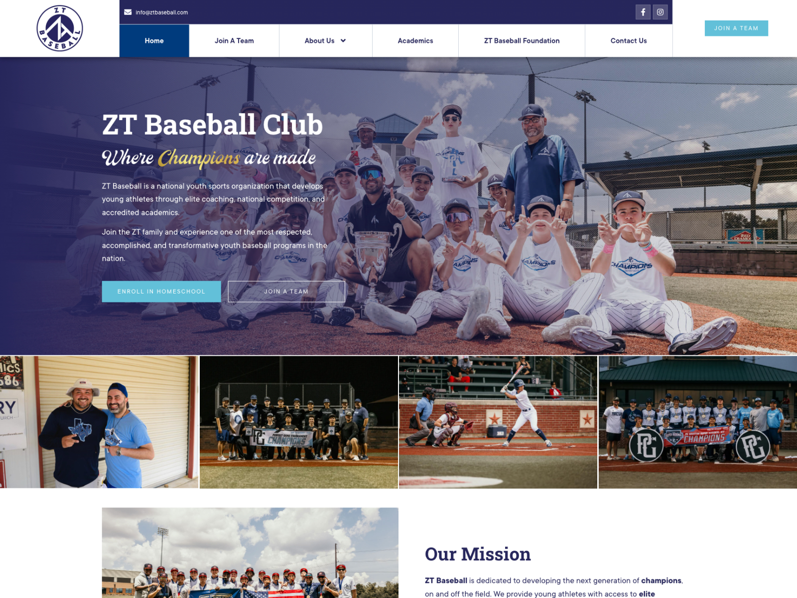 ZT Baseball’s website blends high-energy visuals and intuitive UX to capture the spirit of elite youth sports—crafted to inspire athletes, engage parents, and elevate the brand.